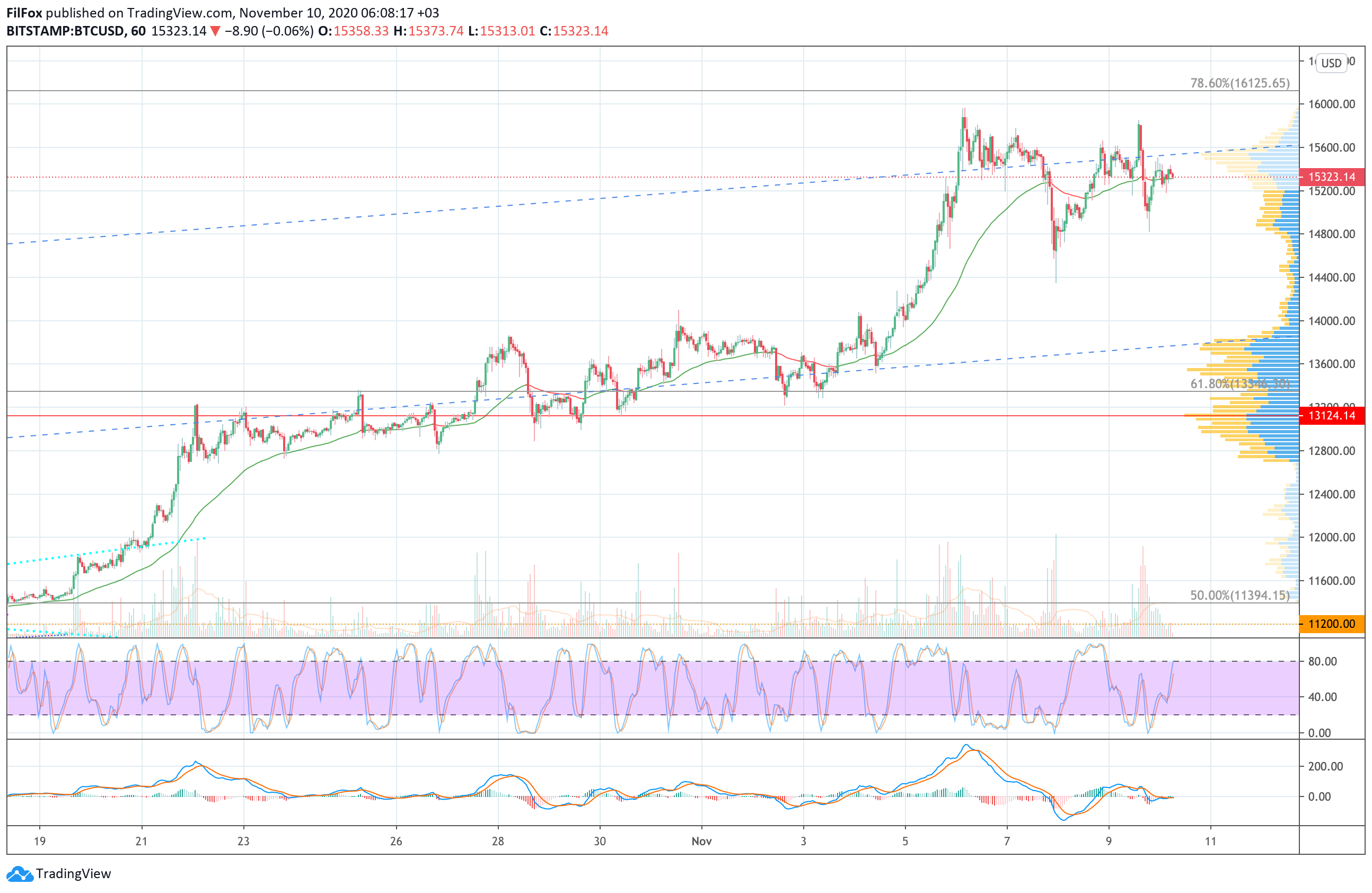 Сегодня попытки ре-теста уровня 78.6% фибоначчи могут повториться. Если быки сформируют мощный импульс, то они пробьют этот уровень и обновят годовой максимум в районе отметки 16200.00 USD.