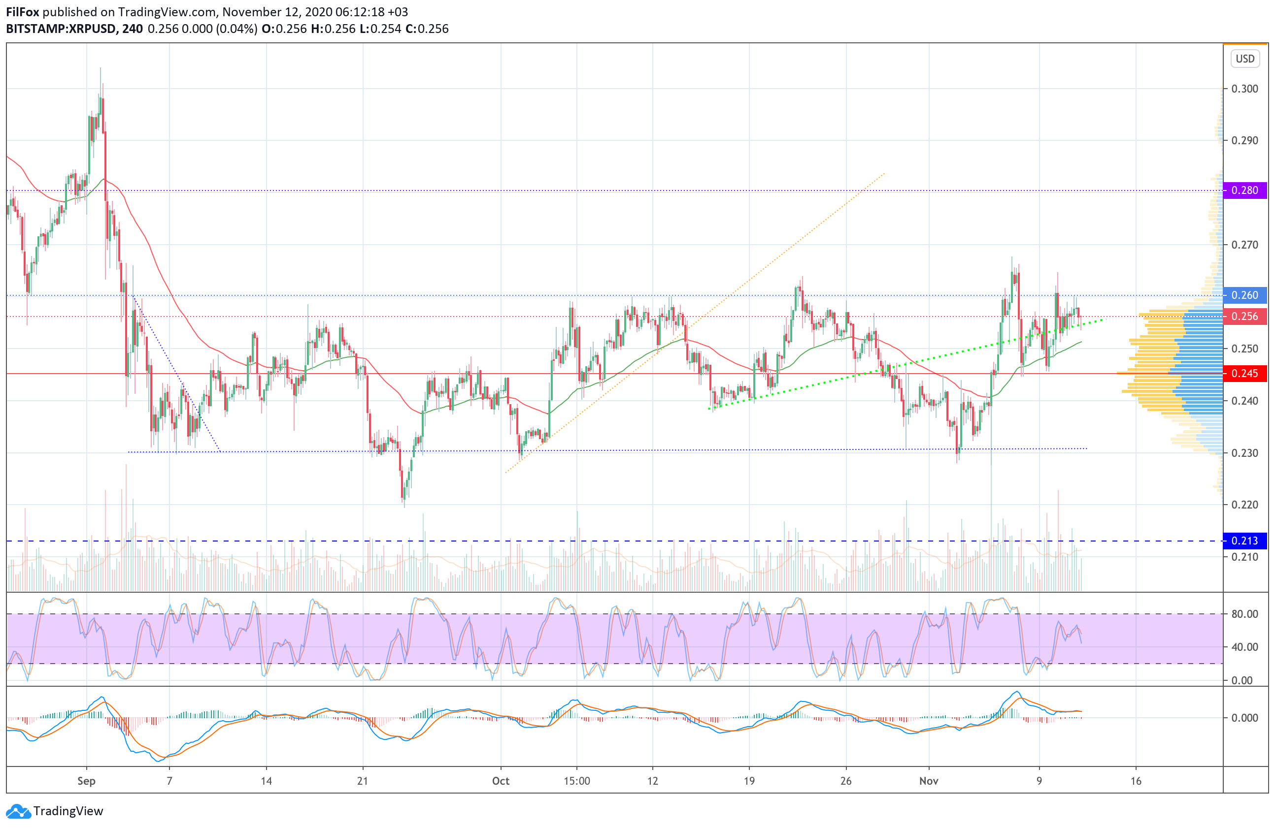 Вчера объёмы торгов не превышали средний уровень, и цена Ripple в течение всего дня провела в пределах бокового коридора, так и не отважившись на прорыв его верхней границы (0.260 USD).