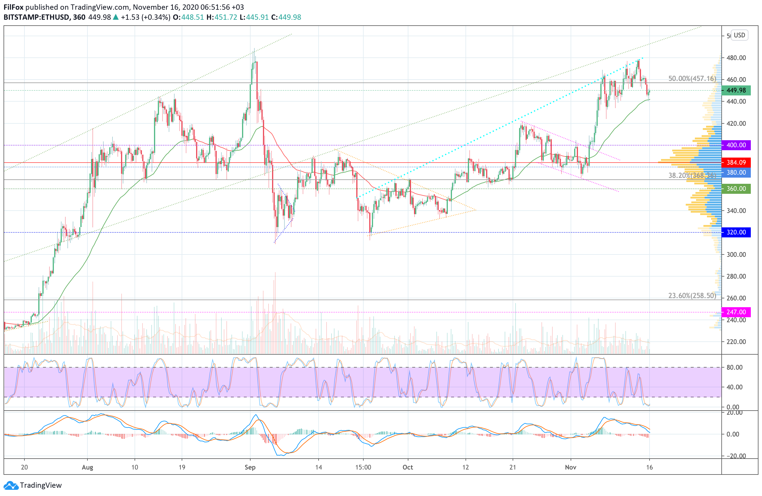 В субботу цена Ethereum откатилась к уровню 50% фибо (457.16 USD) и до воскресенья удерживалась в узкой консолидации над ним. Вчера продавцы смогли пробить поддержку пятидесятипроцентного уровня фибоначчи, и снижение продолжилось в район шестичасовой EMA55 (440.00 USD).