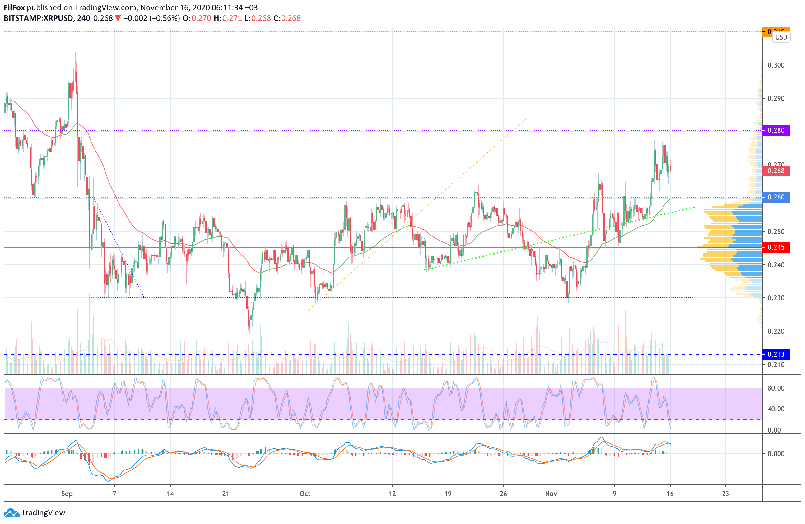 На дневном тайм-фрейме индикатор Stoch RSI зашкаливает на отметке 100 в зоне перекупленности. Пара сможет продолжить рост в область сопротивления 0.280 USD только при поддержке крупных покупателей.