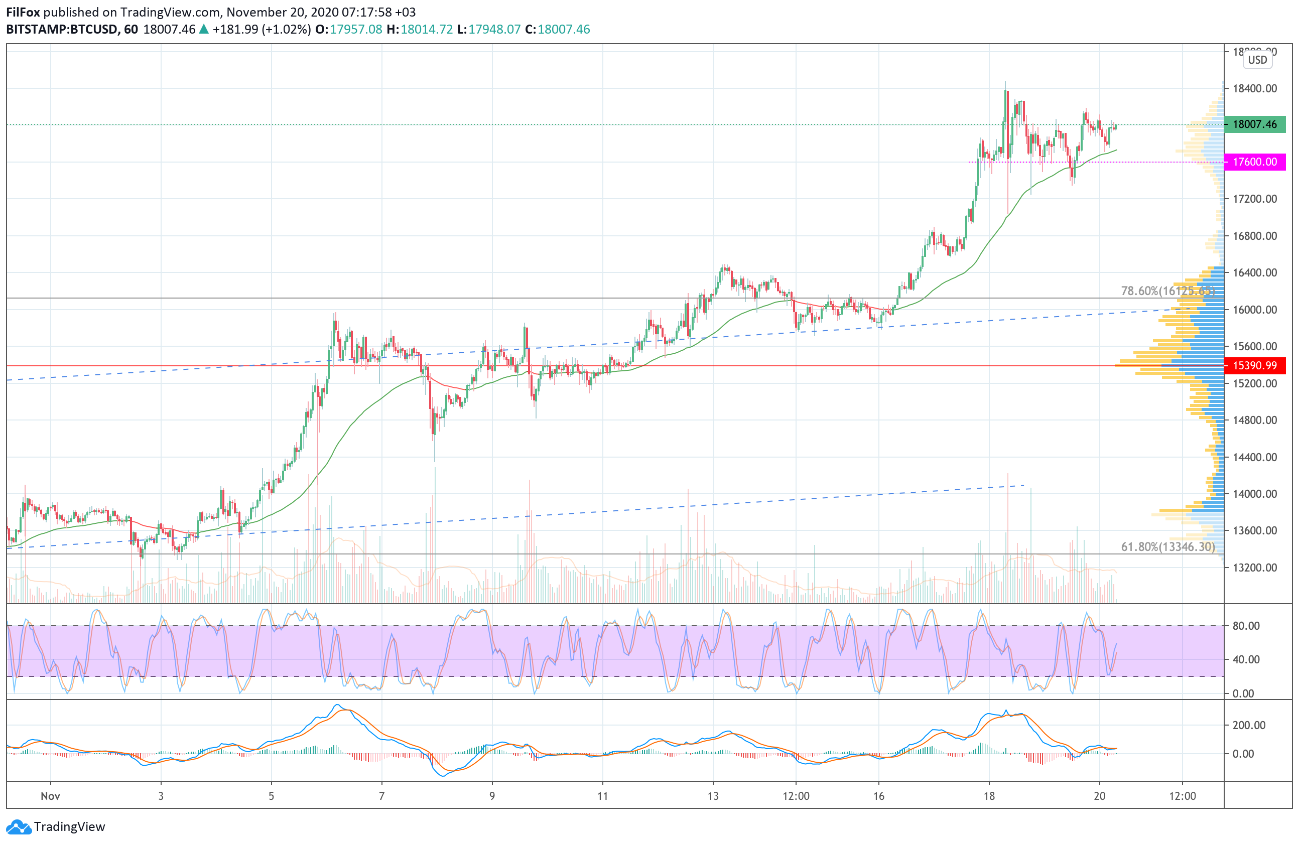 Во второй половине дня покупатели восстановили пару выше психологической отметки 18000.00 USD, однако к концу дня объёмы покупок сократились, и ночью продолжить рост не удалось.