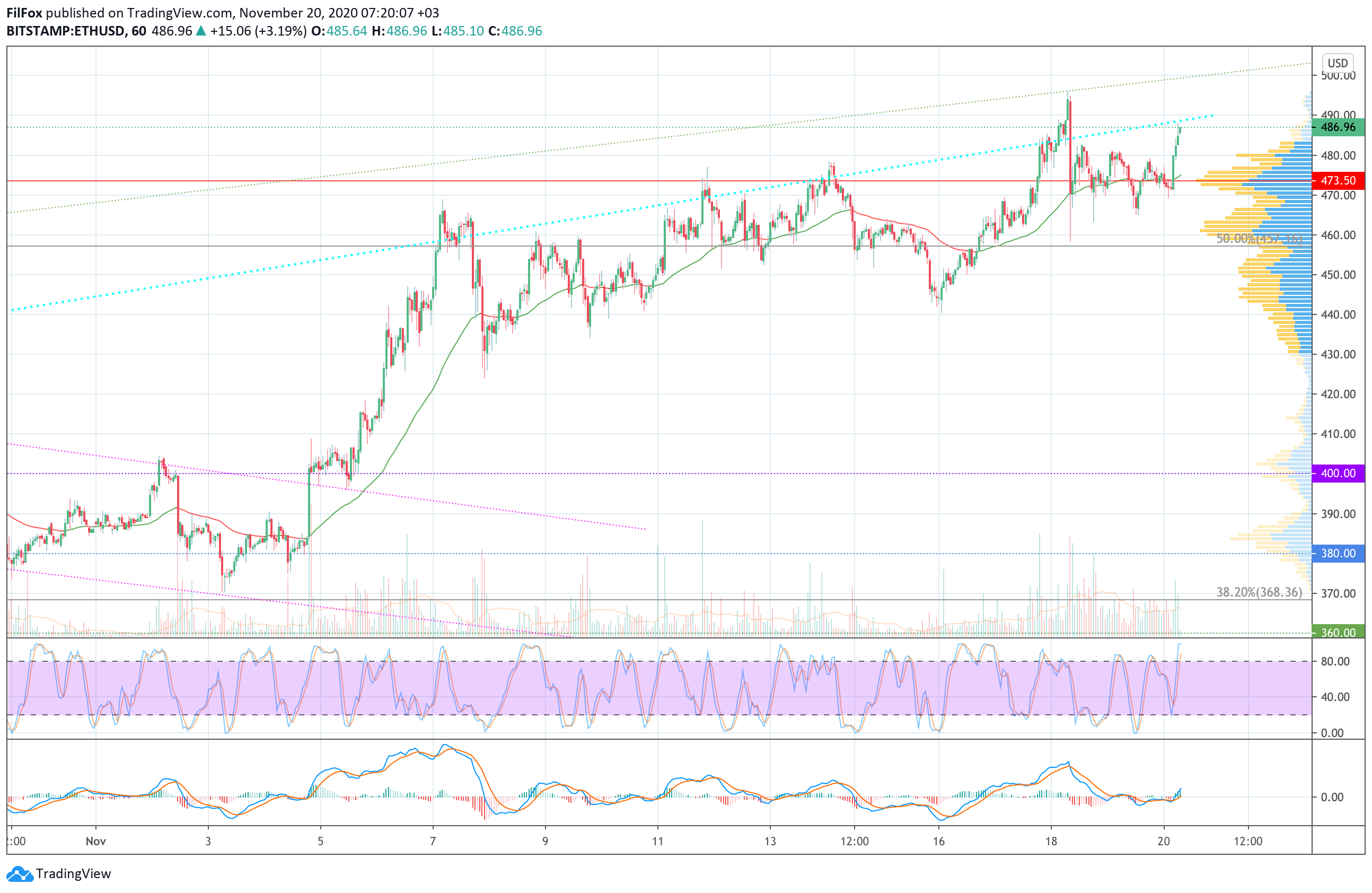 Сегодня ночью цена эфира начала активно восстанавливаться и протестировала восходящую голубую линию тренда. Если быки смогут пробить сопротивление трендовой линии, то рост продолжится к психологической отметке 500.00 USD. В этой области динамика роста замедлиться, а продавцы могут попытаться развернуть пару в откат.