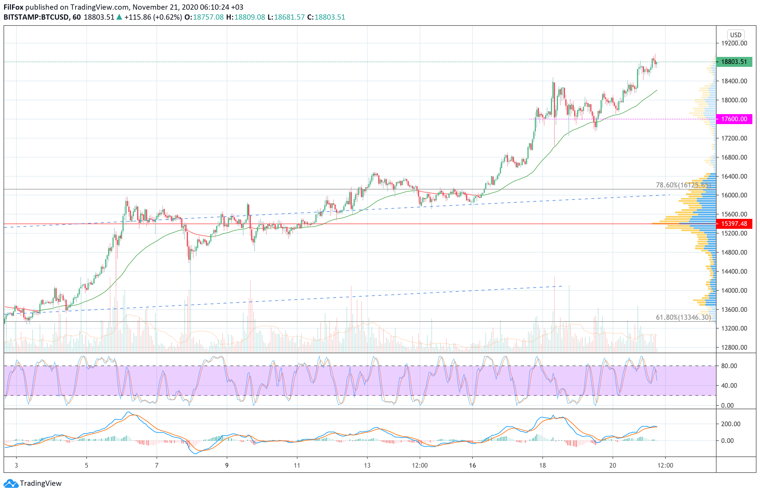 Быки продолжили рост цены Bitcoin и пара в очередной раз обновила годовой максимум, вплотную приблизившись к уровню 19000.00 USD.