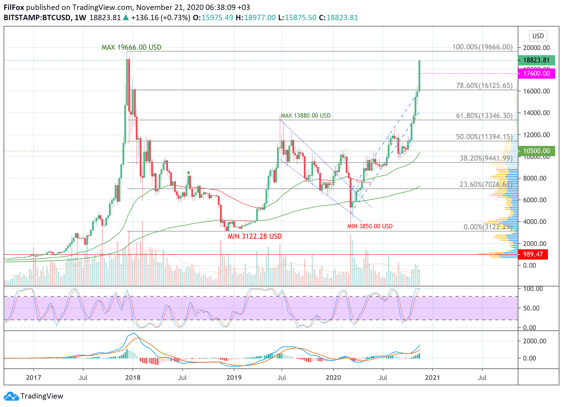 Предположение о прорыве потолка в 20000.00 USD в 2020 году постепенно приобретает более реалистичные очертания, но хватит ли у быков сил в ближайшее время обновить исторический максимум на сильно перегретом рынке - вопрос пока открытый.