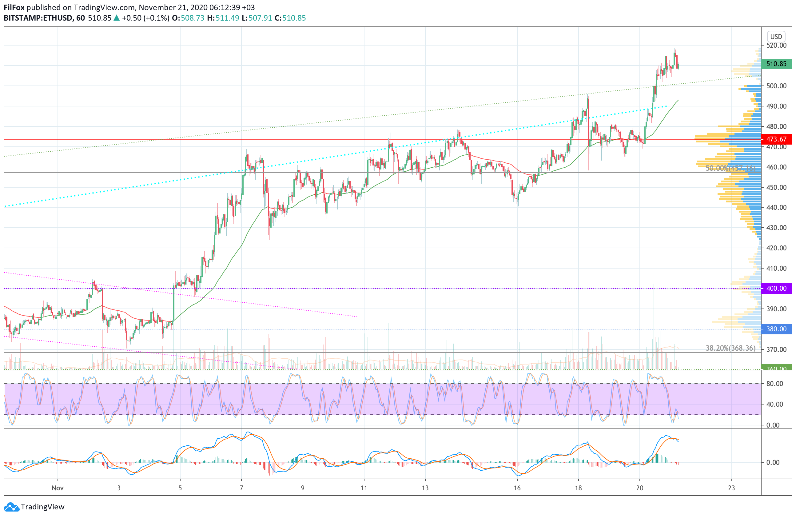 Утренний рост цены Ethereum вчера приостановился на психологической отметке 500.00 USD. Однако, быкам удалось продолжить рост и до конца дня цена эфира обновила годовой максимум в районе 515.00 USD.