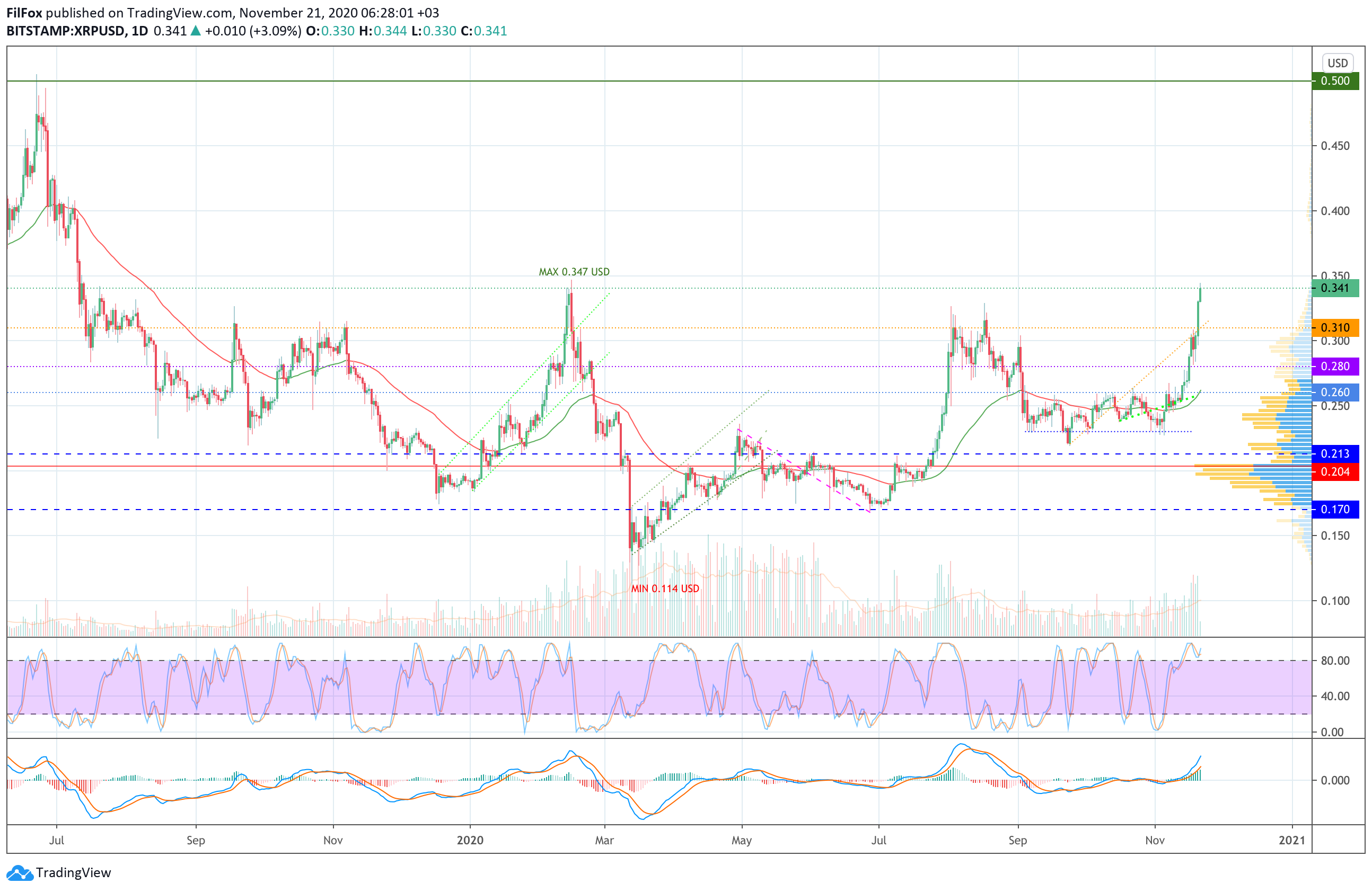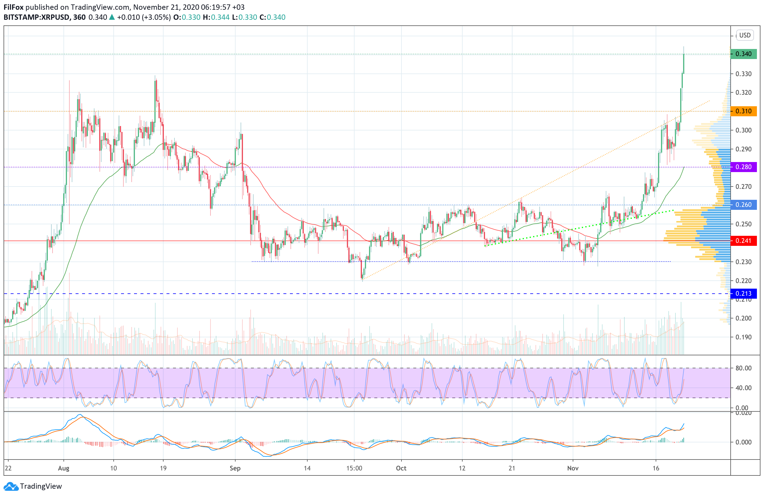 Вчера объёмы покупок существенно превышали средний уровень и цена Ripple пробила сопротивление 0.310 USD. Рост продолжился в область годового максимума, но до настоящего момента пара так и не смогла обновить максимум, установленный 15 февраля 2020 года в точке 0.347 USD.