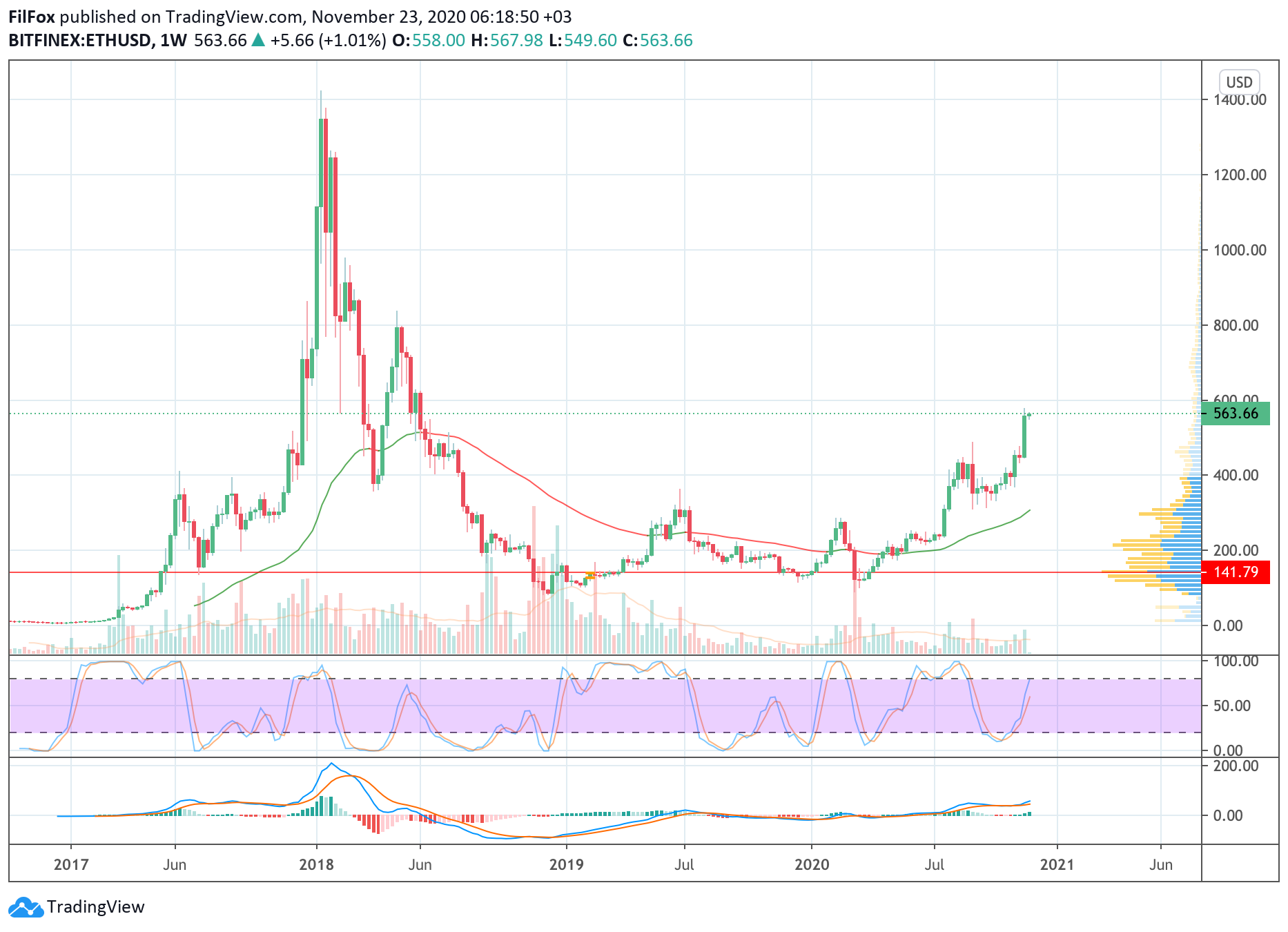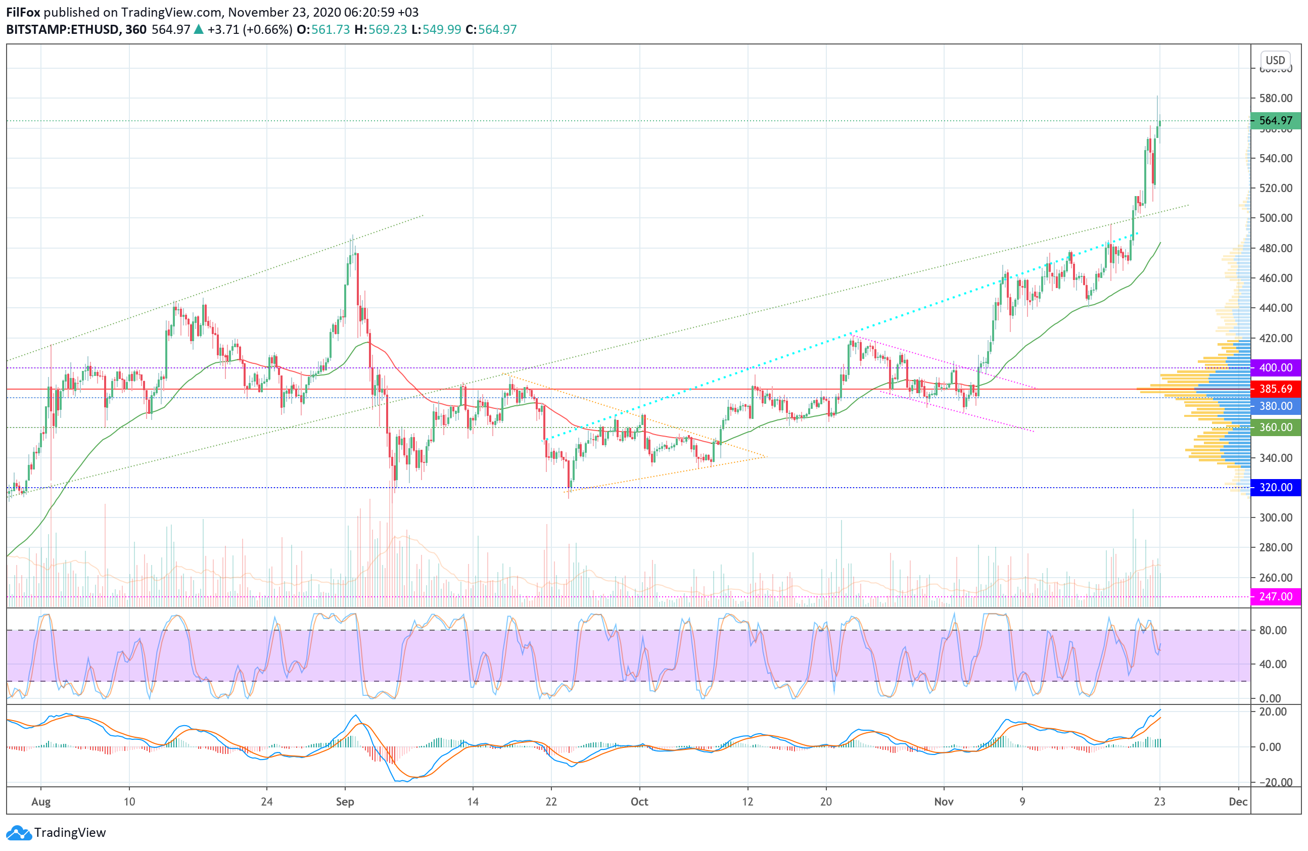 Последний раз цена эфира консолидировалась в районе отметки 600.00 USD летом 2018 года. Если сегодня утром быки пробьют сопротивление 580.00 USD, то рост может продолжится к новому годовому максимуму в районе отметки 610.00 USD.