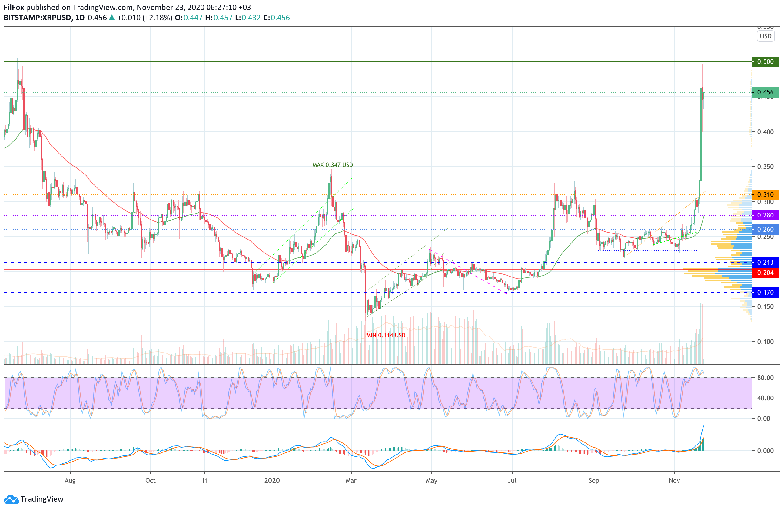 На выходных ажиотажный рост цены Ripple продолжился, и пара пробила уровень 0.400 USD, установив новый годовой максимум в точке 0.497 USD.