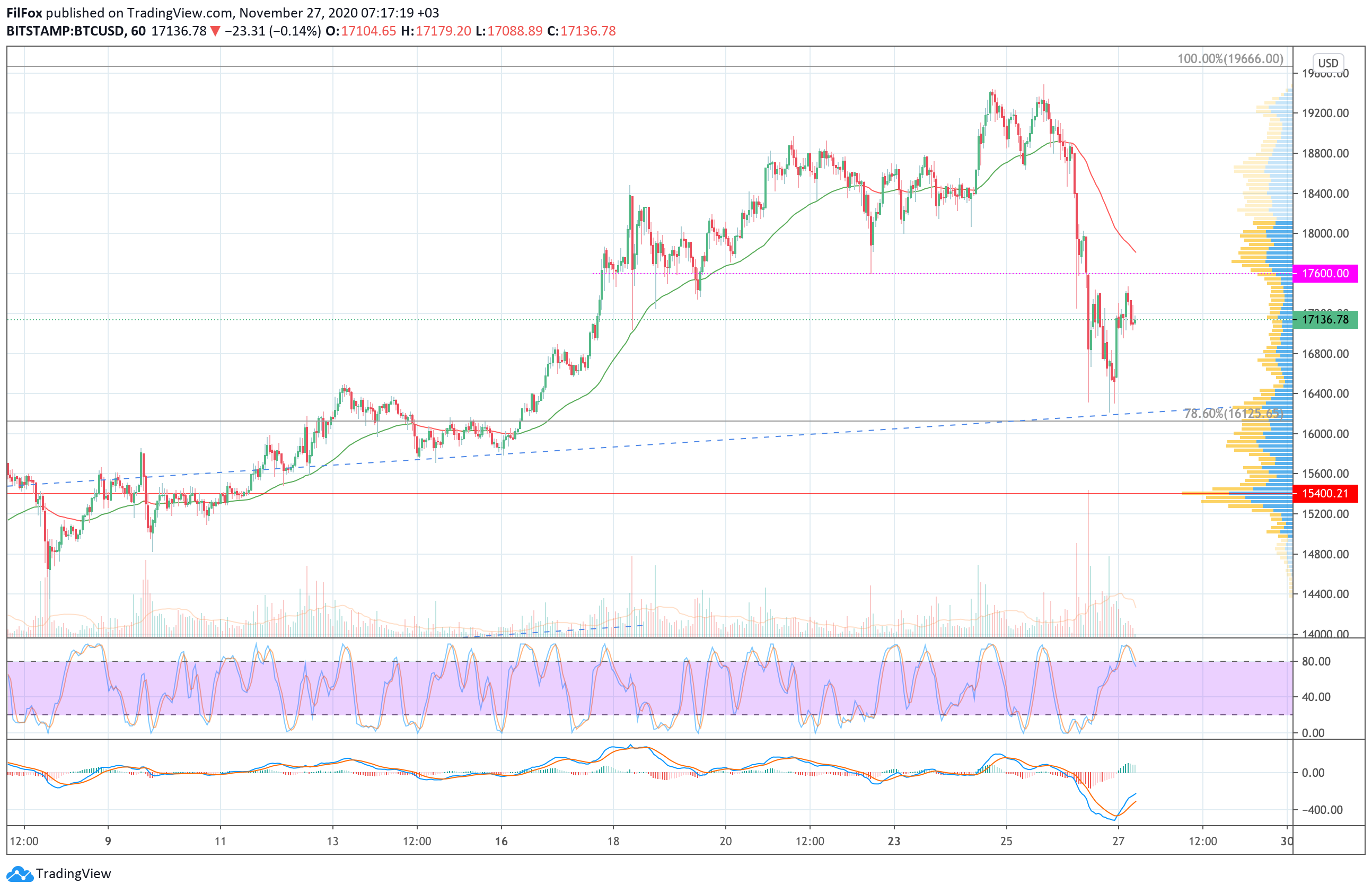 Верхняя граница восходящего синего канала развернула пару на восстановление, и за минувшую ночь покупатели попытались восстановить цену. Однако, восстановление не было поддержано крупными объёмами и приостановилось в районе отметки 17400.00 USD, а под утро цена откатилась к уровню 17000.00 USD. Если этот слабый уровень окажет цене поддержку, то покупатели попытаются продолжить восстановление выше сопротивления 17600.00 USD.