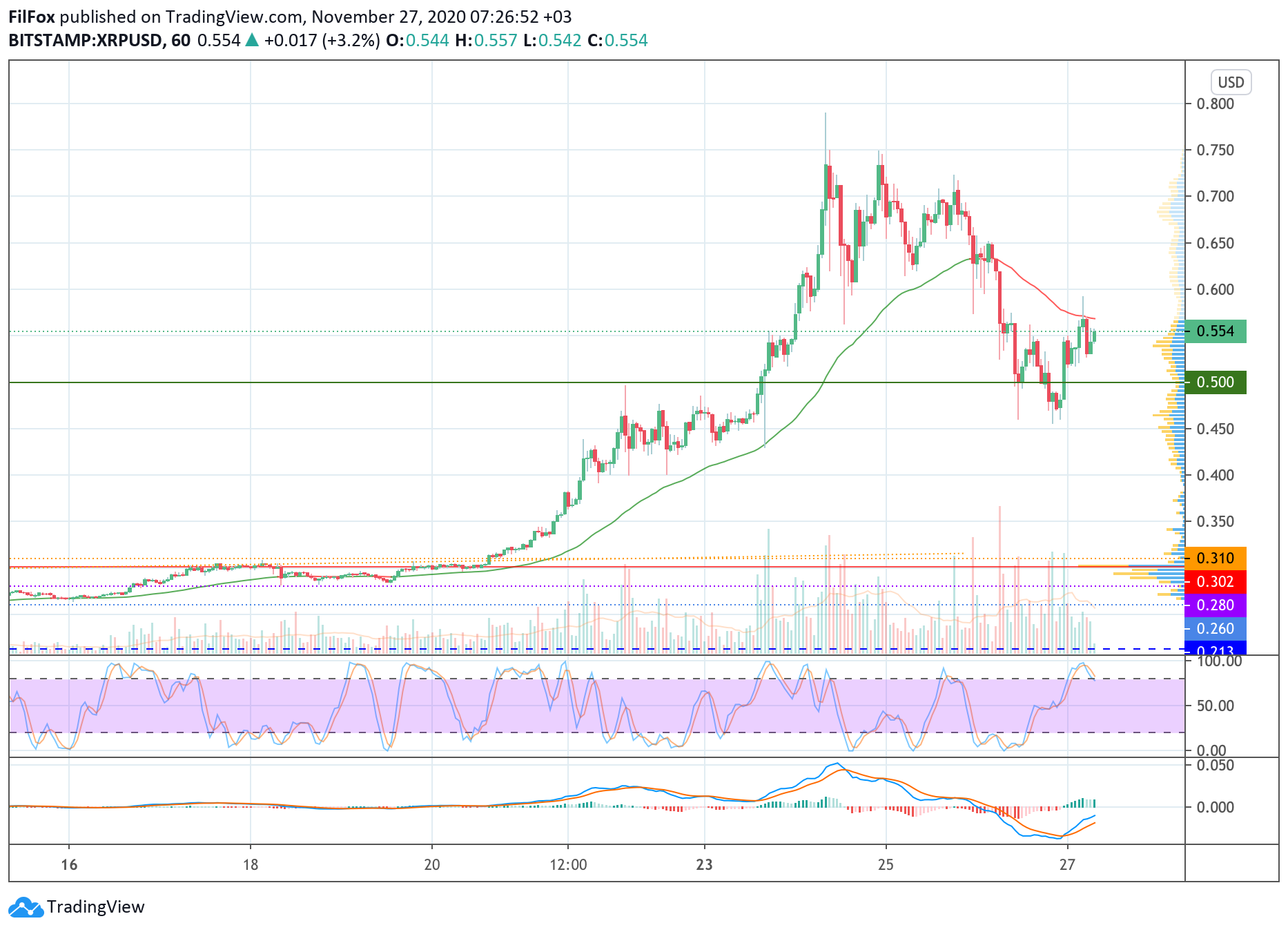 Объёмы покупок пока небольшие и цена XRP не может закрепиться выше часовой EMA55, но если покупатели прорвут сопротивление скользящей средней, то пара может восстановиться в район отметки 0.650 USD.