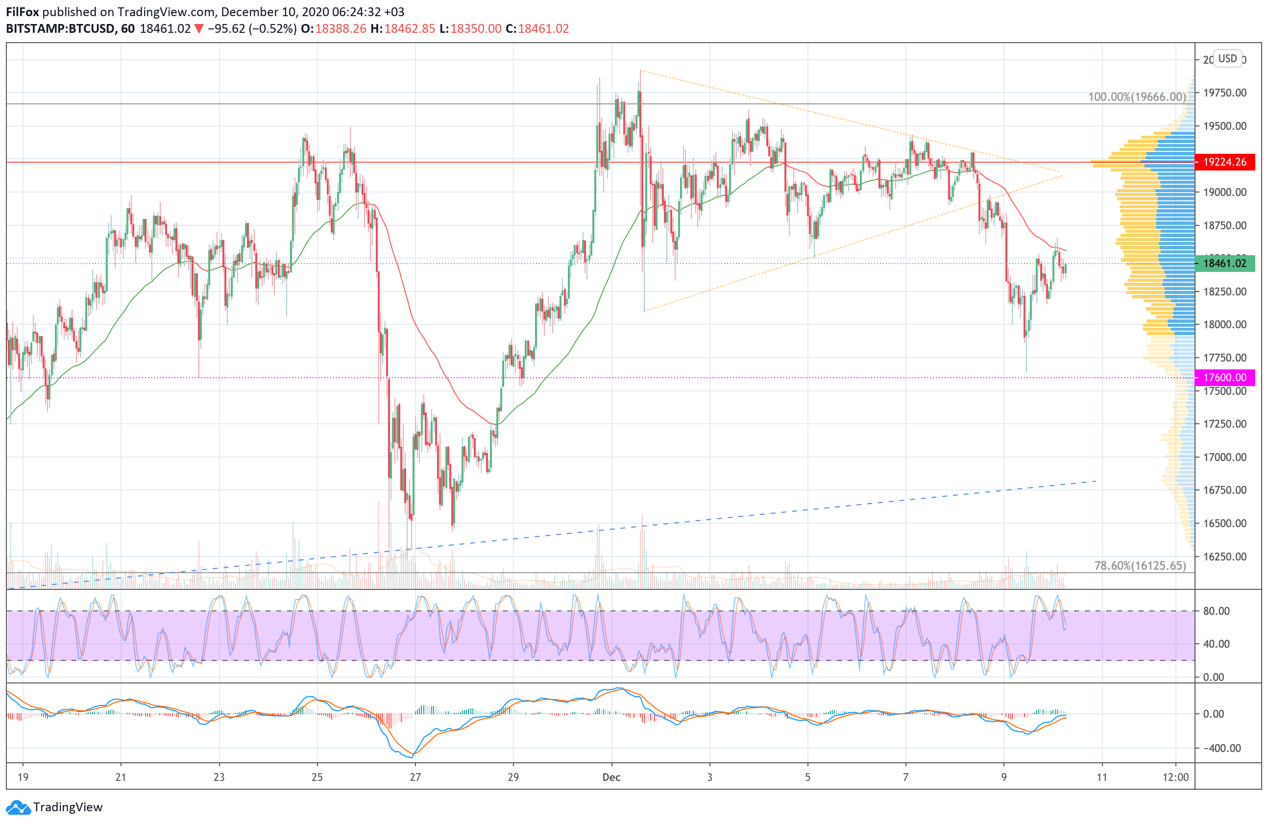Вчера, в первой половине дня, снижение цены BTC продолжилось к поддержке 17600.00 USD. Декабрьский минимум установлен в районе отметки 17640.00 USD, после чего покупатели восстановили пару в область средних цен.