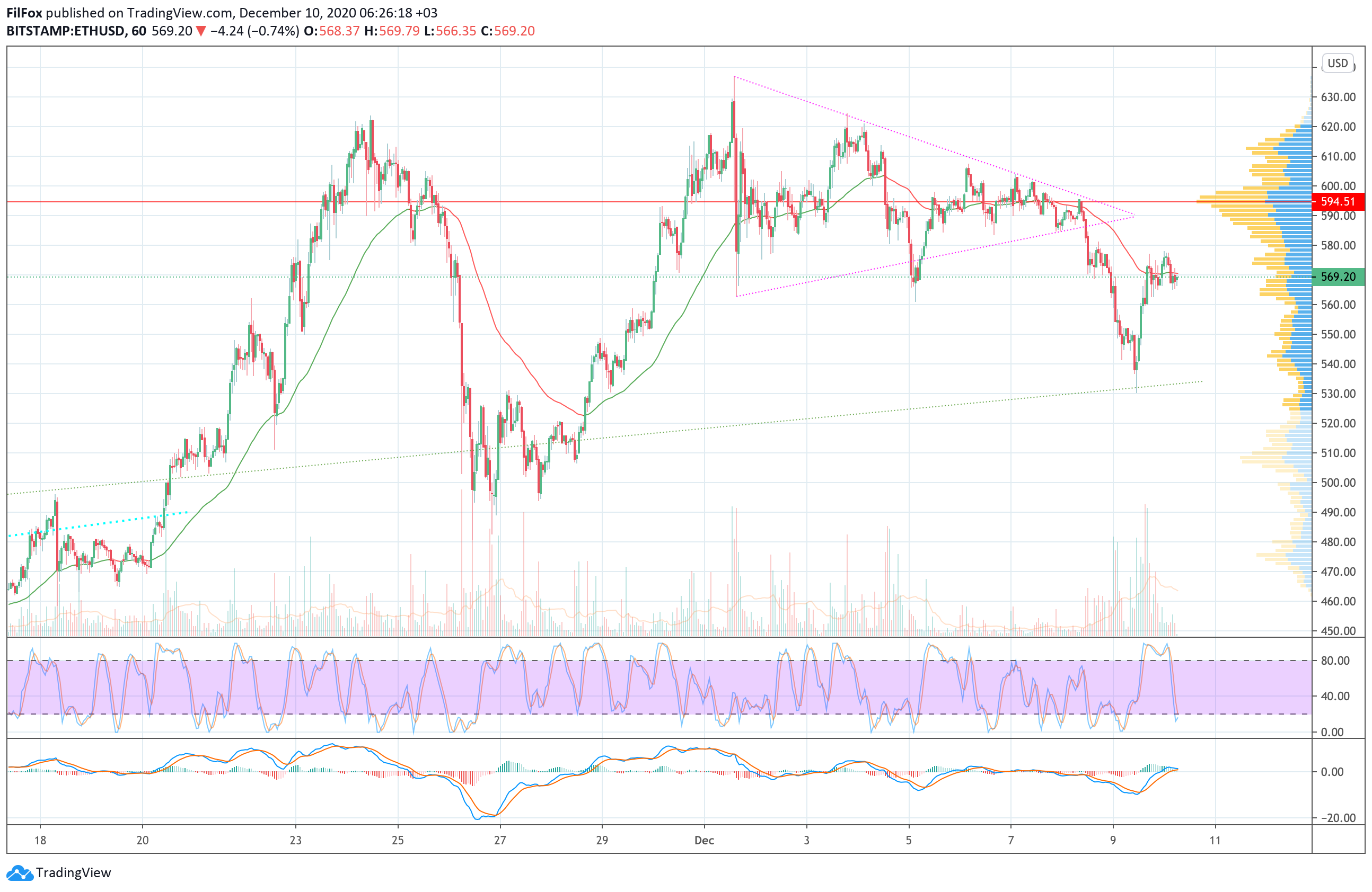 Вчера утром снижение цены Ethereum продолжилось, и пара протестировала восходящую зелёную линию тренда. Недельный минимум был установлен в районе отметки 530.00 USD, но цена эфира сразу отскочила в область средних цен. До сегодняшнего утра пара пытается закрепится возле часовой EMA55.