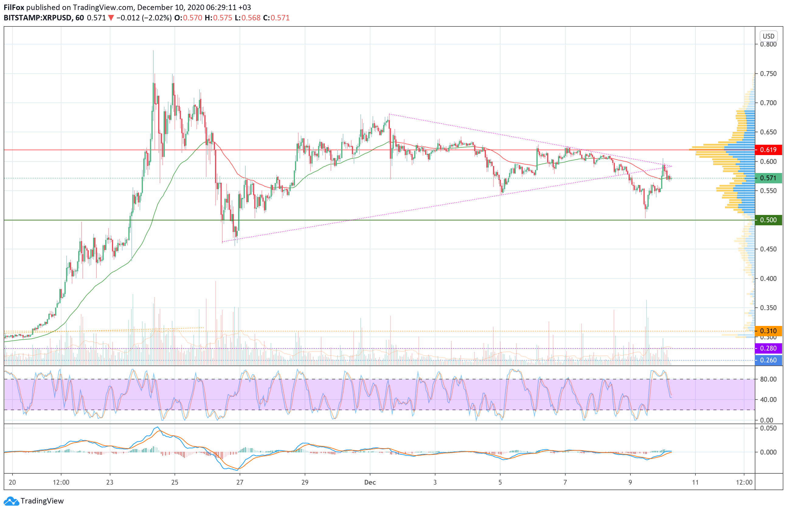 Вчерашнее снижение цены Ripple остановилось в районе психологической отметки 0.500 USD. До завершения дня покупатели успели восстановить цену выше часовой EMA55, а поздно ночью протестировали верхнюю границу фиолетового треуголника, которая приостановила восстановление.