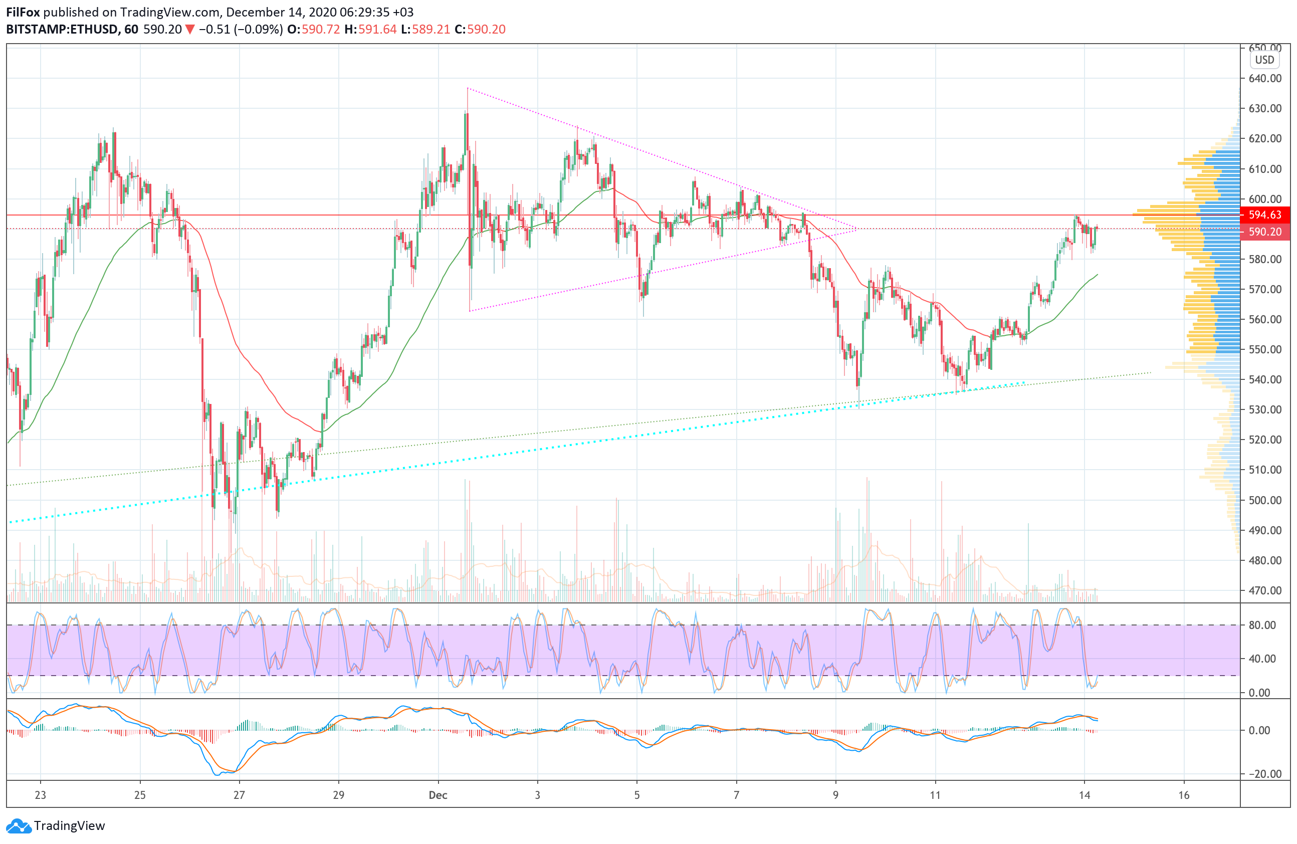 В минувшую субботу покупатели закрепились выше уровня часовой EMA55, а в воскресенье цена Ethereum протестировала линию POC (594.63 USD).