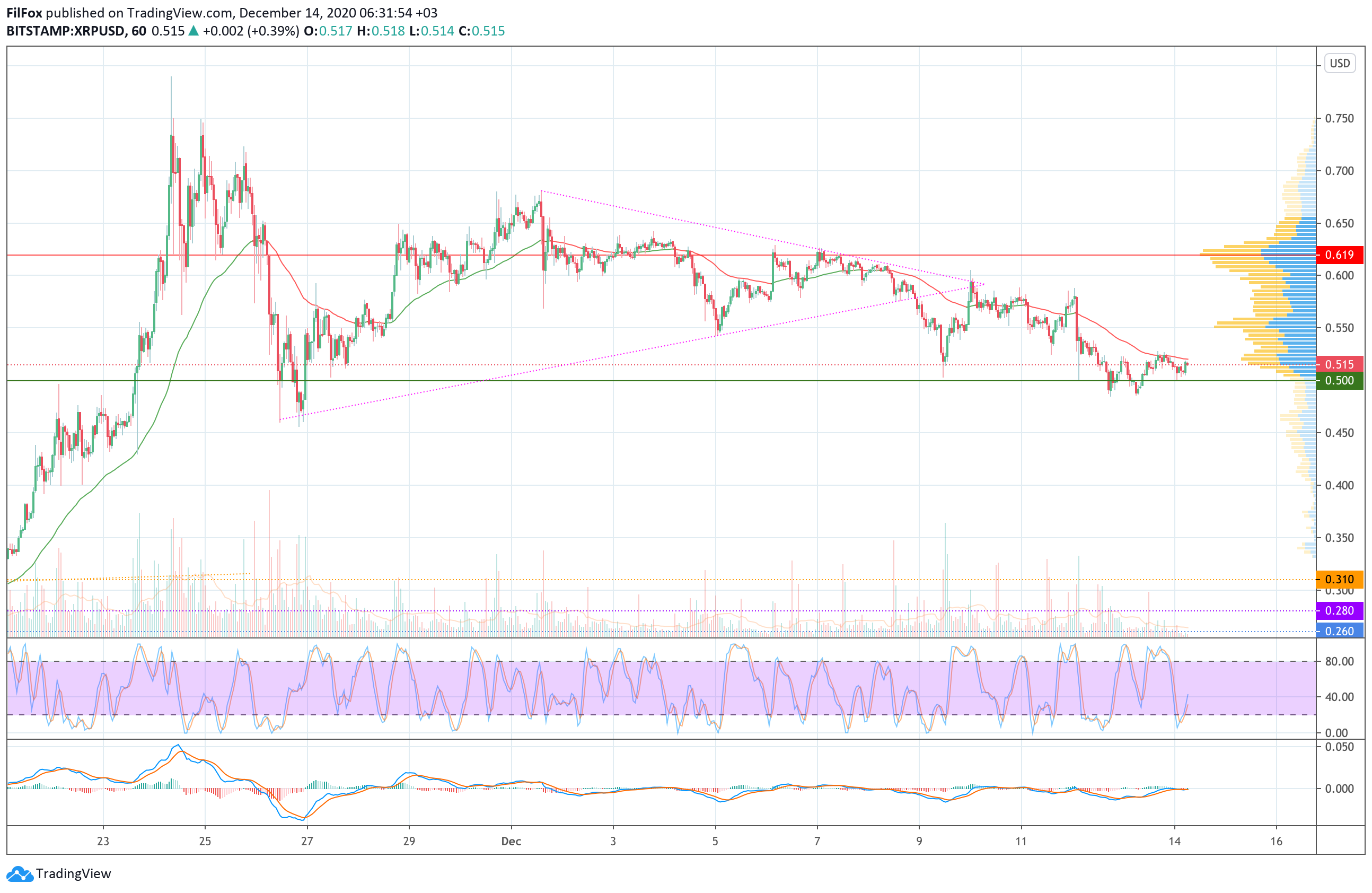 Цена Ripple на минувших выходных не смогла преодолеть сопротивление часовой EMA55 и до конца недели покупатели боролись с прессингом медведей, которые пытались оттеснить пару ниже психологической отметки 0.500 USD.
