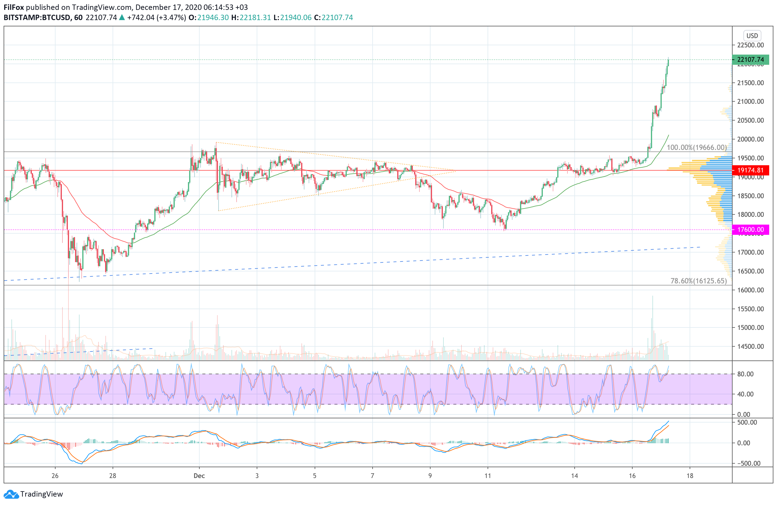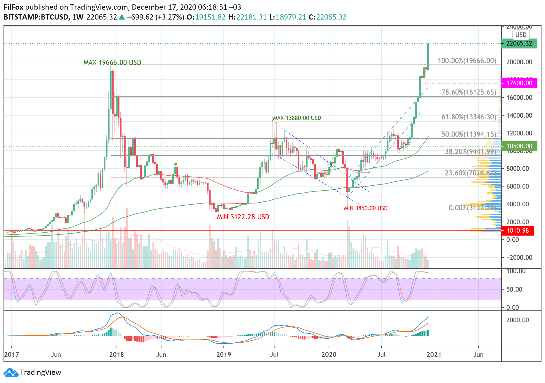 Ровно три года прошло с того дня, когда 17 декабря 2017 года цена биткоина впервые за всю историю своего существования достигла абсолютного максимума в районе отметки 20000.00 USD. Сегодня, 17 декабря 2020 года цена BTC достигла нового исторического максимума в точке 22181.31 USD и продолжает расти.