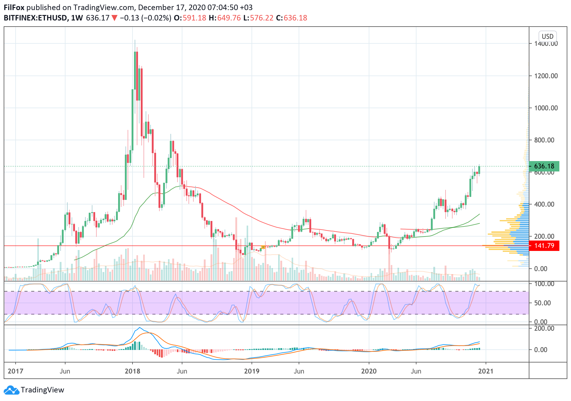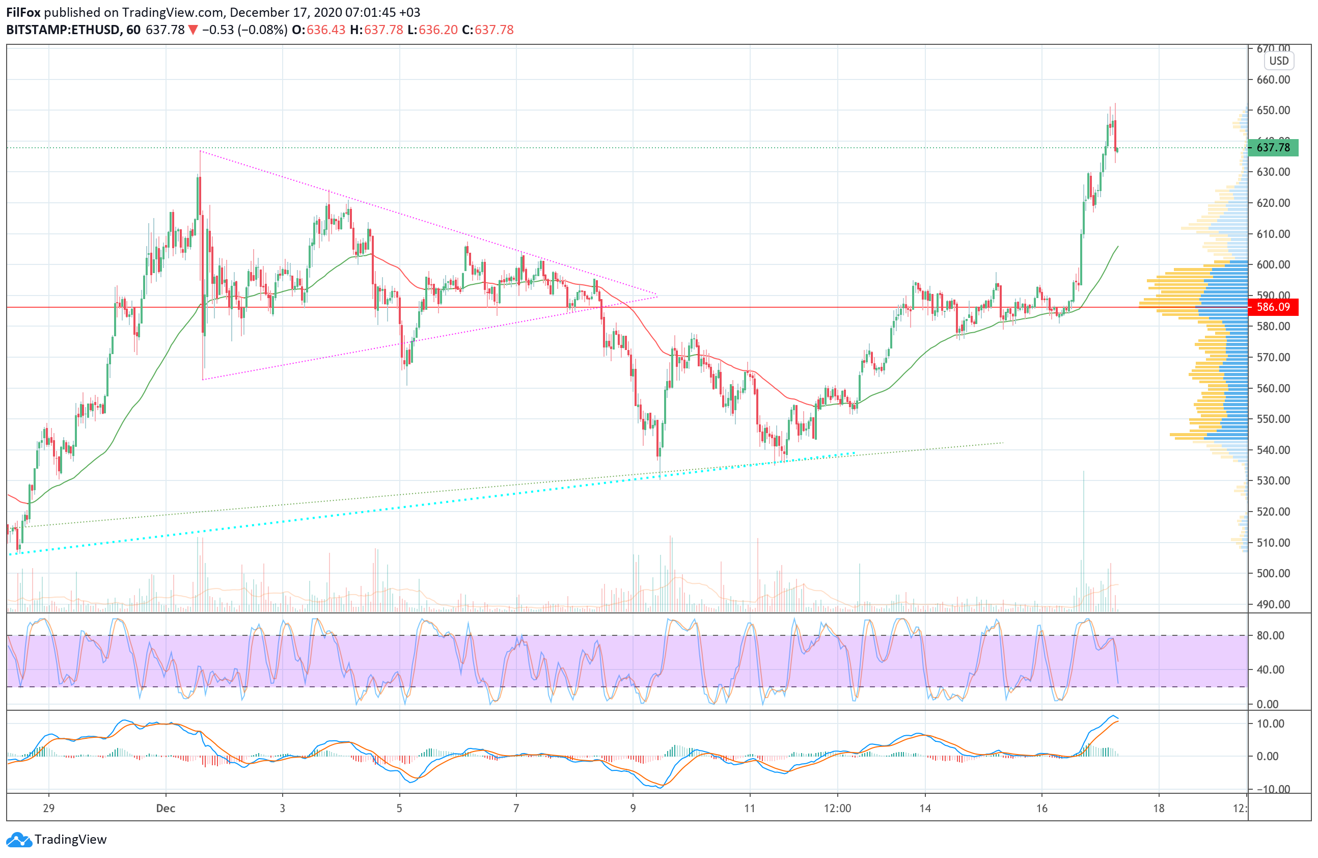 Во второй половине дня цена эфира вернулась в зону годового максимума, установленного в начале декабря, а в завершении дня пара обновила годовой рекорд до отметки 653.00 USD.