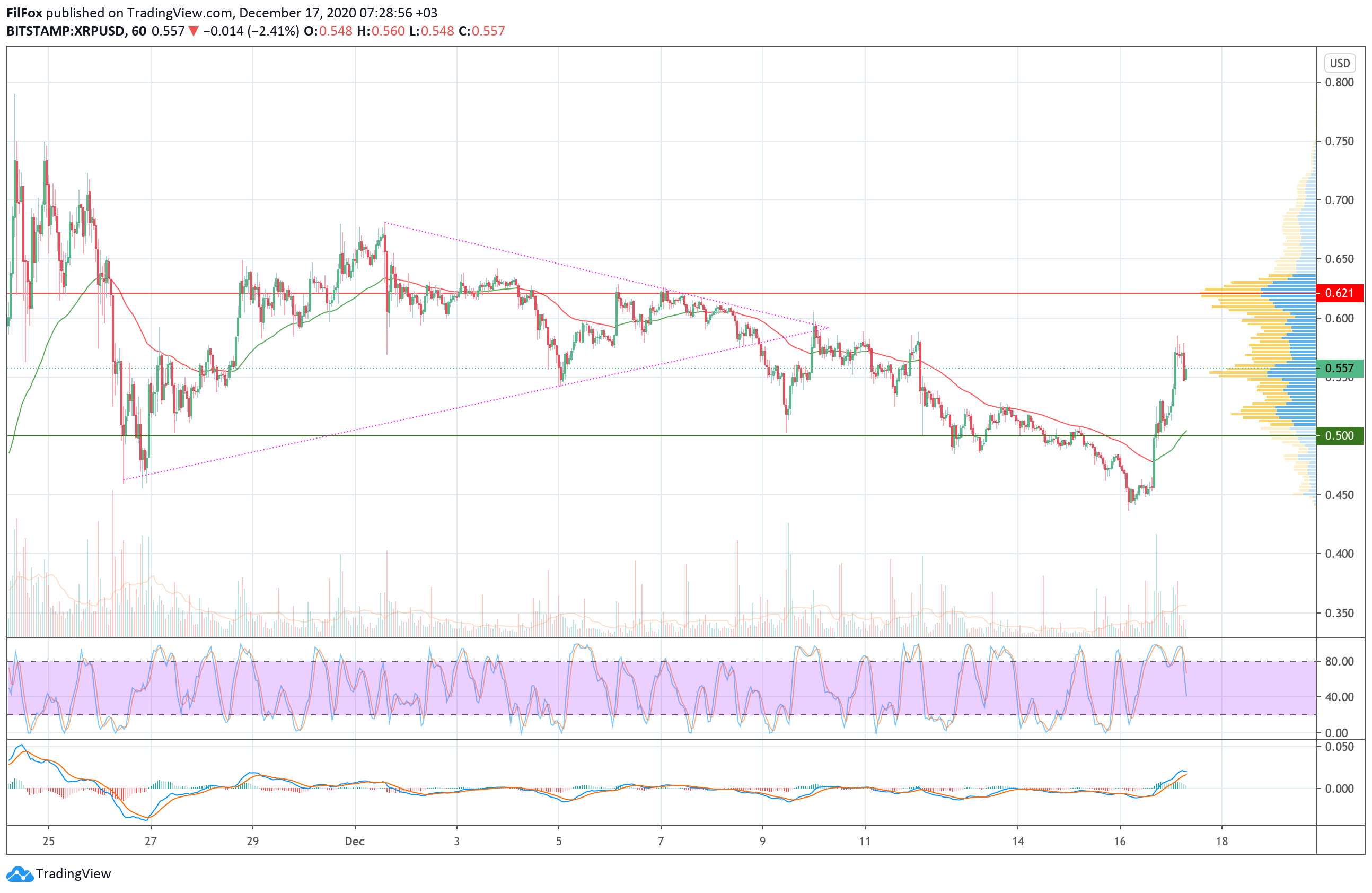 До конца дня цена удержалась выше психологической отметки 0.500 USD, а ночью рост продолжился, но до сегодняшнего утра пара не успела вернуться в район линии POC. Если на рынке сохранятся оптимистические настроения, то рост Ripple продолжится и цена закрепится выше индикаторной линии Volume Profile.