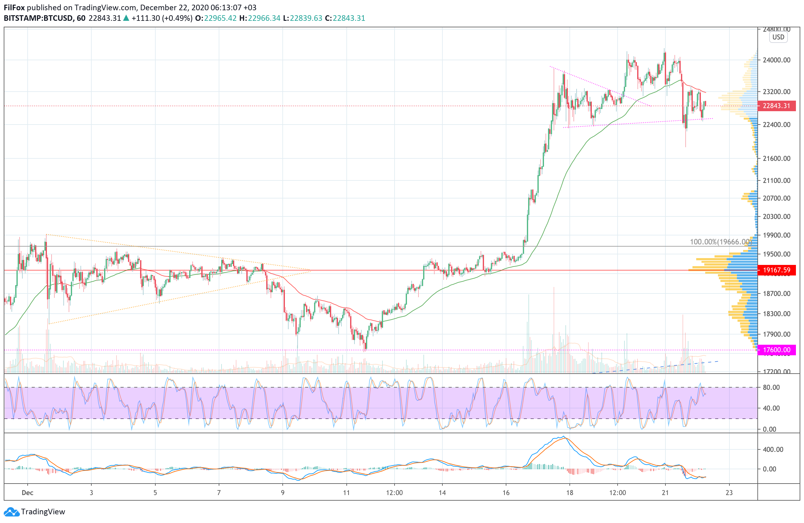 Вчера медведям удалось продавить уровень средних цен и днём пара откатилась ниже фиолетовой поддержки 22400.00 USD. Дневной минимум продавцы обозначили в районе отметки 21865.00 USD, а покупатели до конца дня поспешили восстановить пару к часовой EMA55.