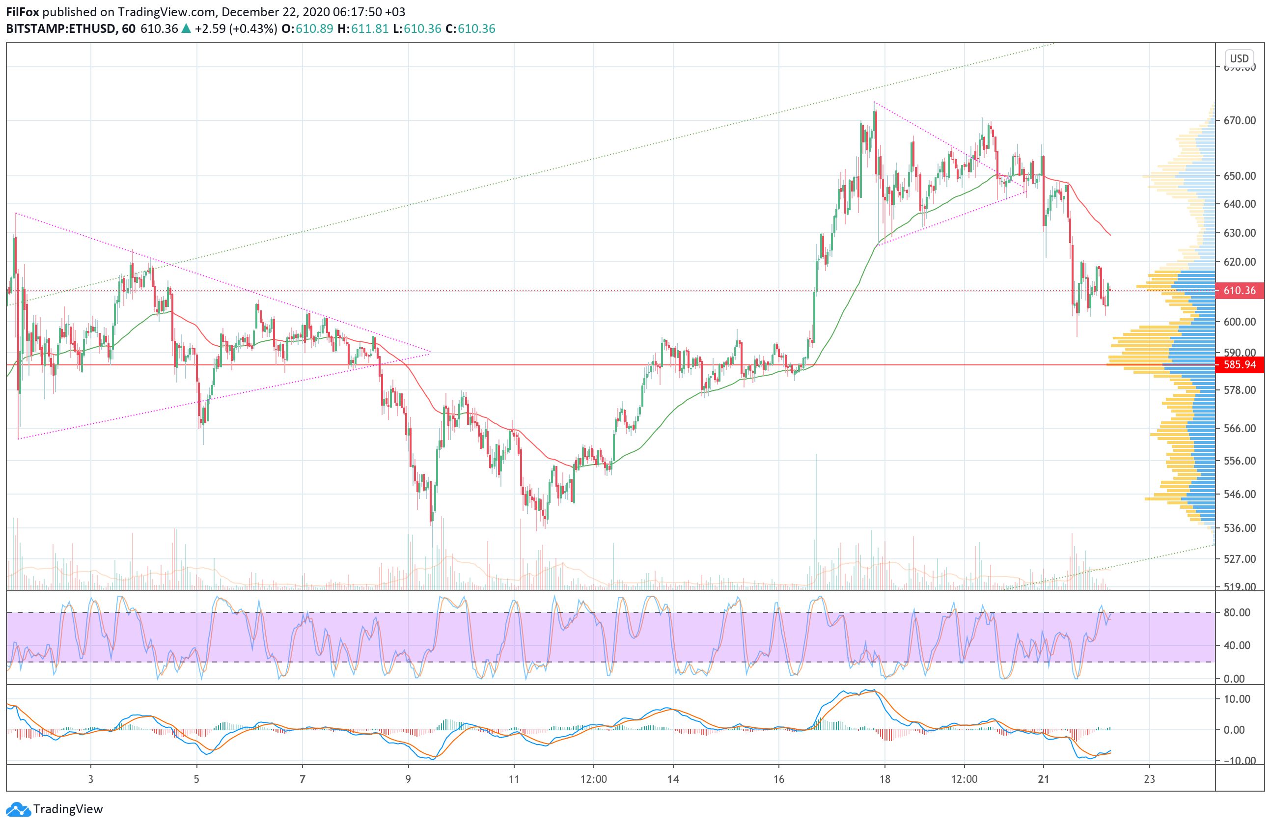 Покупатели сразу же попытались исправить ситуацию и восстановили пару выше отметки 600.00 USD. До сегодняшнего утра цену удалось стабилизировать в боковом направлении между поддержкой 600.00 USD и уровнем 620.00 USD, который выполняет сейчас роль сопротивления.