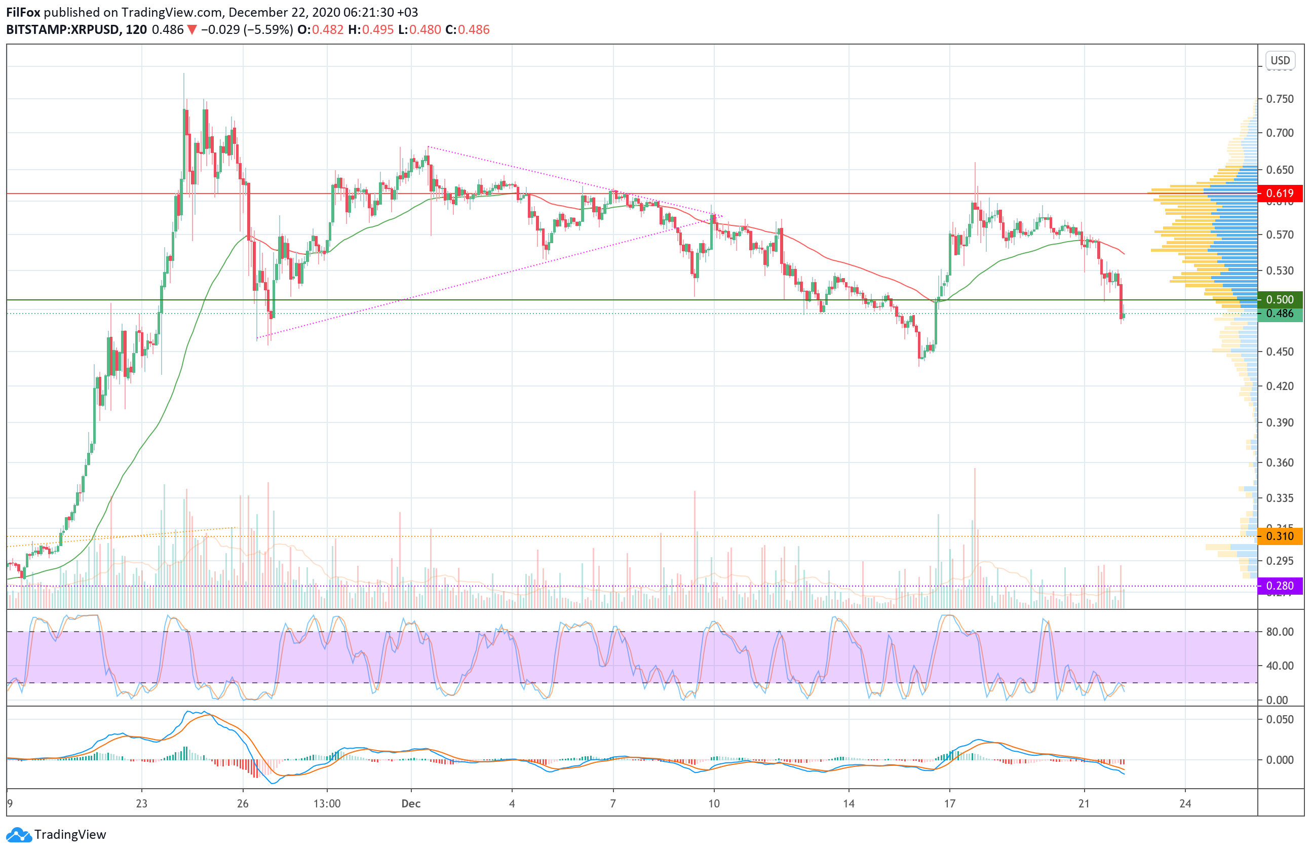 Вчера давление со стороны медведей усилилось и психологический уровень 0.500 USD не смог удержать цену Ripple от снижения к поддержке 0.480 USD.