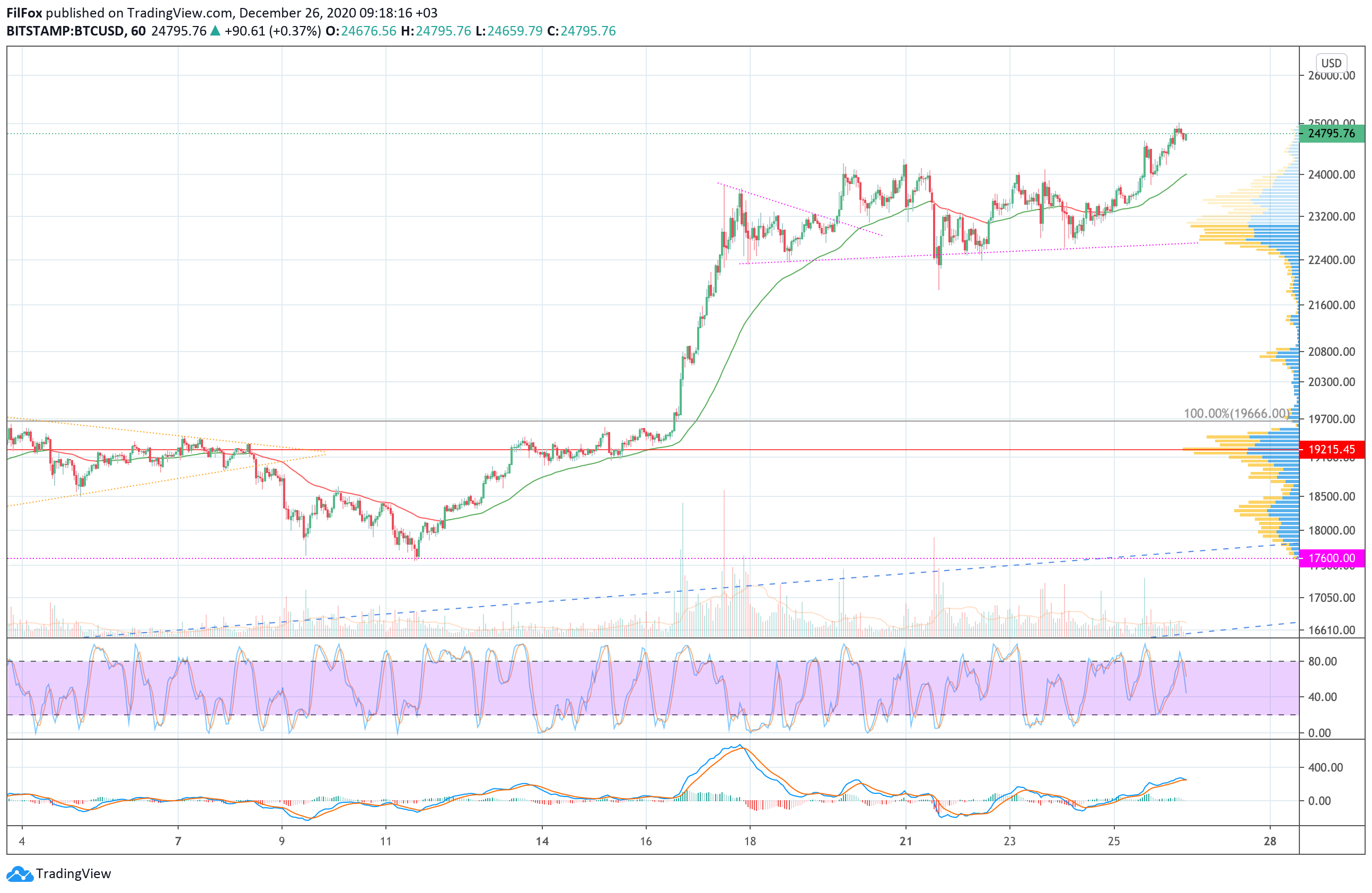 Сегодня ночью быки продолжили ралли и обновили абсолютный максимум в районе отметки 25000.00 USD.