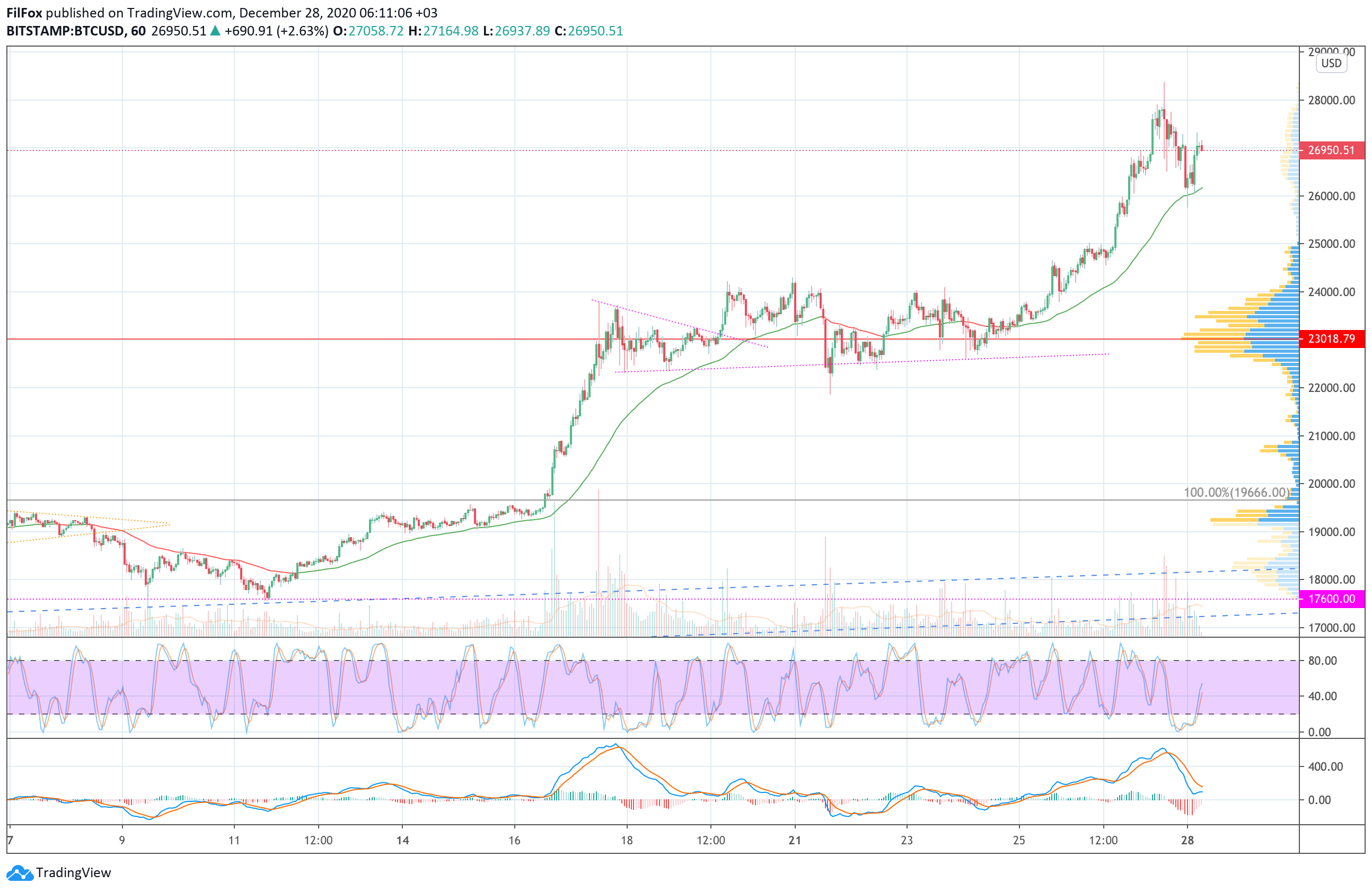 На минувших выходных бычий забег продолжился и вчера днём цена биткоина установила исторический максимум в районе отметки 28 378.00 USD. В этот момент индекс доминирования Bitcoin на рынке превысил 72%.