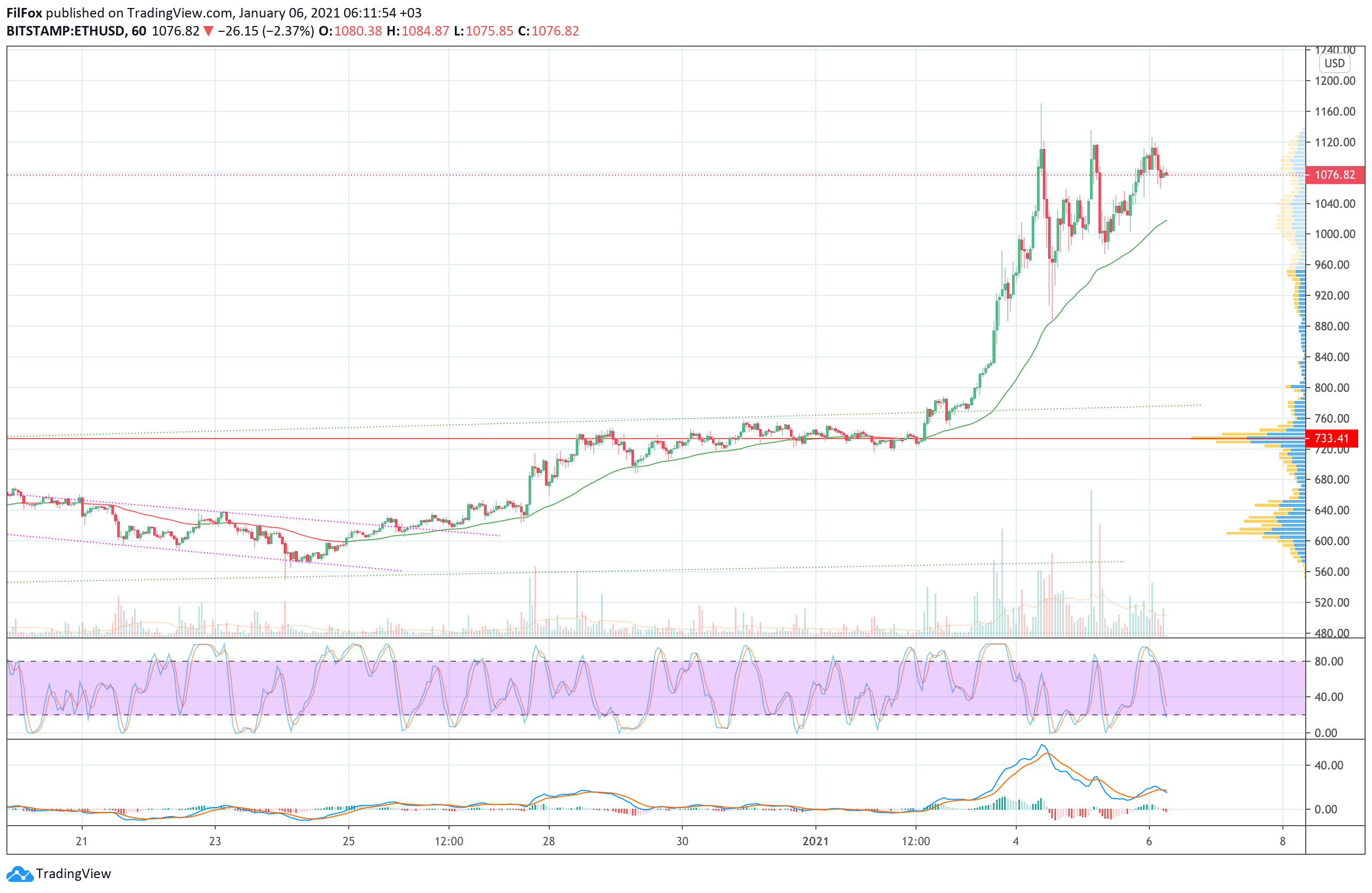 Вчера утром цена Ethereum упала ниже психологической отметки 1000.00 USD, но покупатели смогли остановить снижение в районе часовой скользящей средней EMA55.