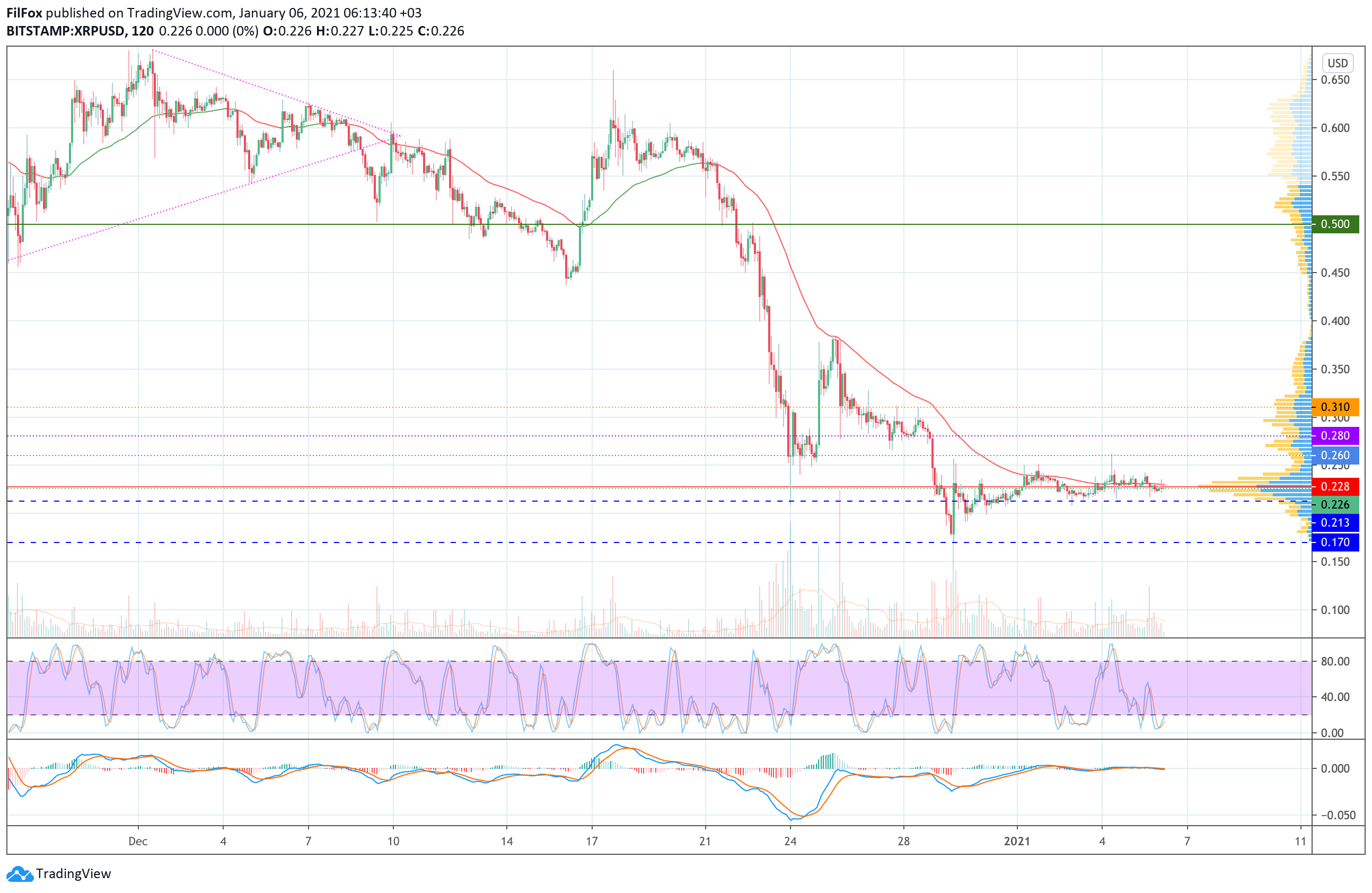 Цена Ripple закрепилась в узком боковике на уровне линии POC (0.228 USD). Несмотря на всплеск объёмов продаж больше среднего уровня, пара смогла удержаться над верхней границей синего коридора (0.213 USD).