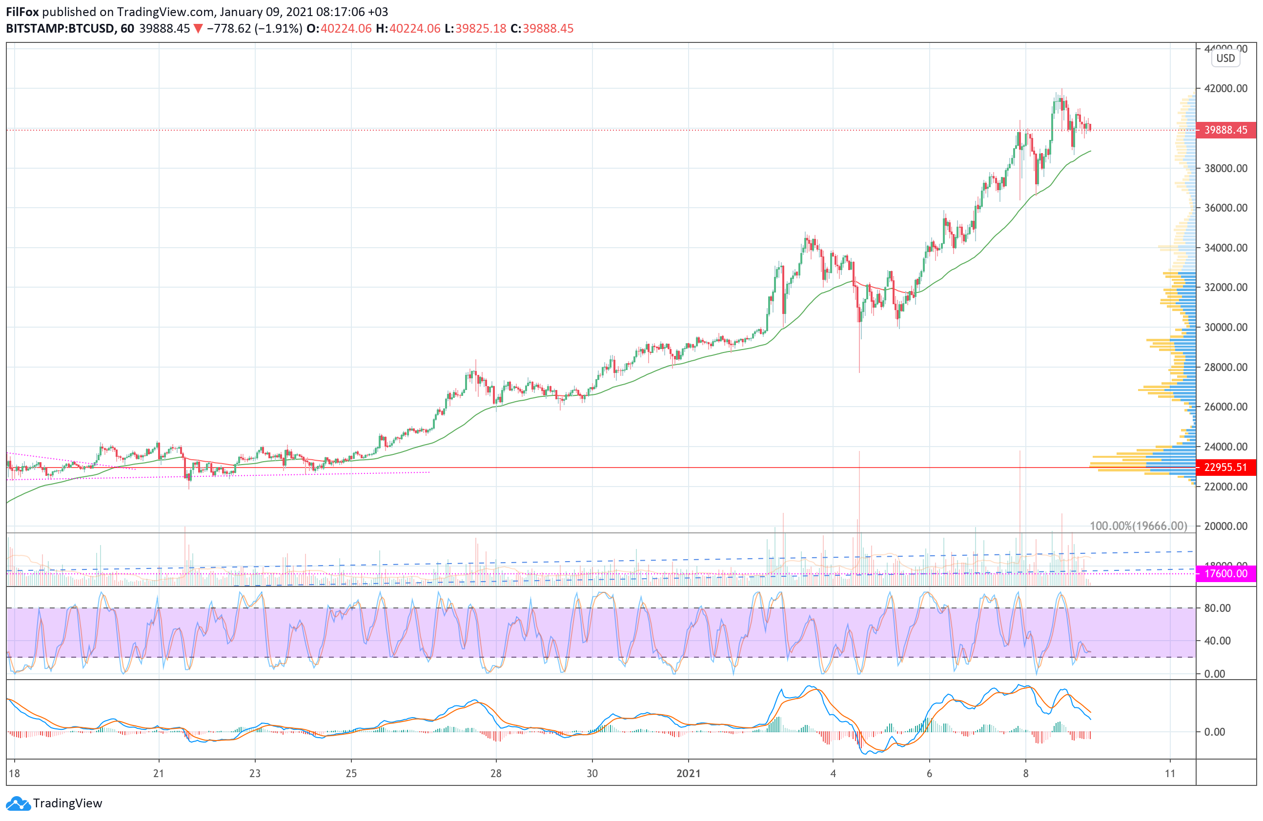Во второй половине дня абсолютный максимум был установлен на отметке 42000.00 USD, после чего новая волна продаж откатила пару к неизменной поддержке в виде часовой скользящей средней EMA55, которая проходила в районе отметки 38000.00 USD.