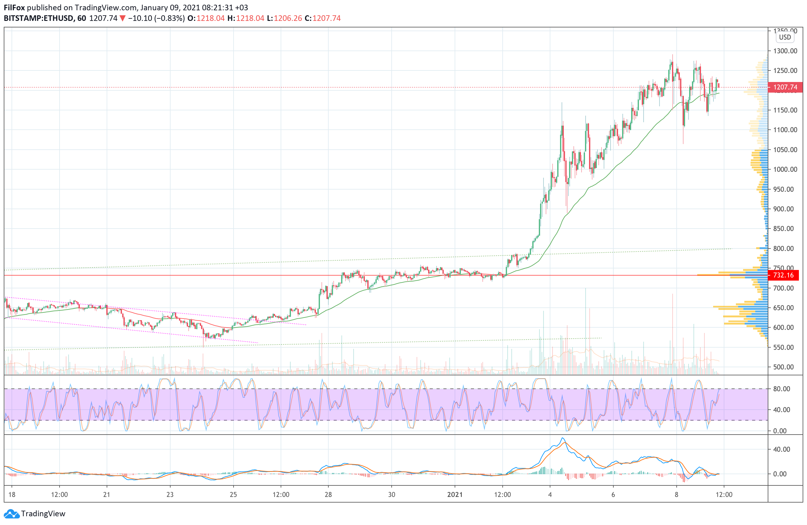 Вчера утром довольно глубокий откат пары ETH/USD (ниже EMA55) не позволил покупателям продолжить рост цены эфира к новому январскому максимуму.