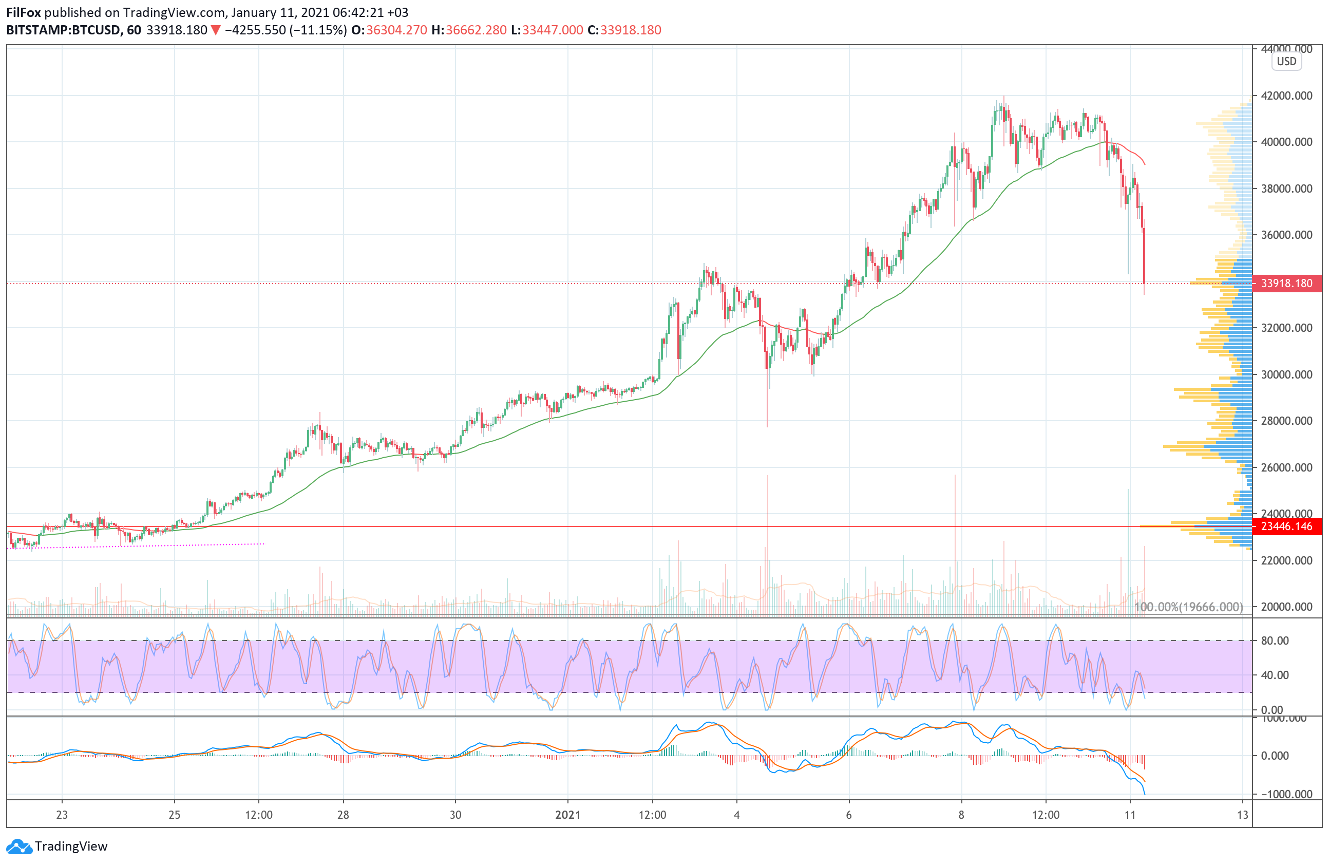 Интенсивное падение цены биткоина вызвало ажиотаж на рынке и пара может продолжить снижение в область еле заметной поддержки на уровне 32600.00 USD. Если эта поддержка не ослабит натиск продавцов, то до конца дня цена протестирует психологическую отметку 30000.00 USD.