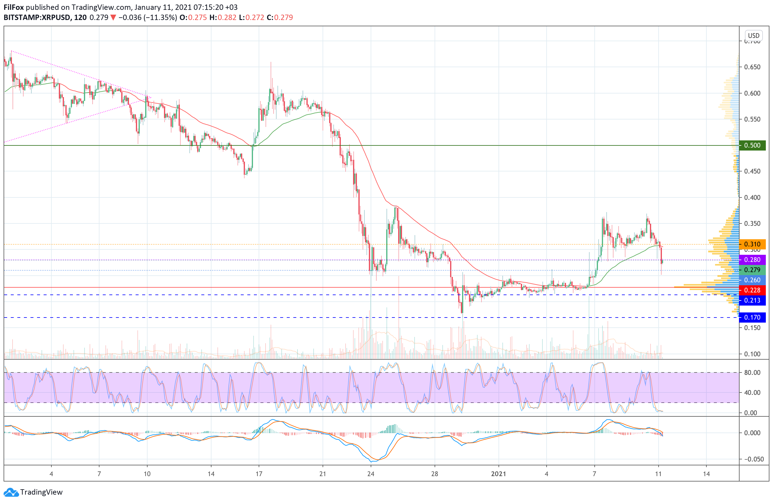 Вчера покупатели пытались продолжить восстановление цены XRP выше январского максимума 0.372 USD, но коррекция рынка привела к откату, в результате которого пара протестировала поддержку 0.260 USD.