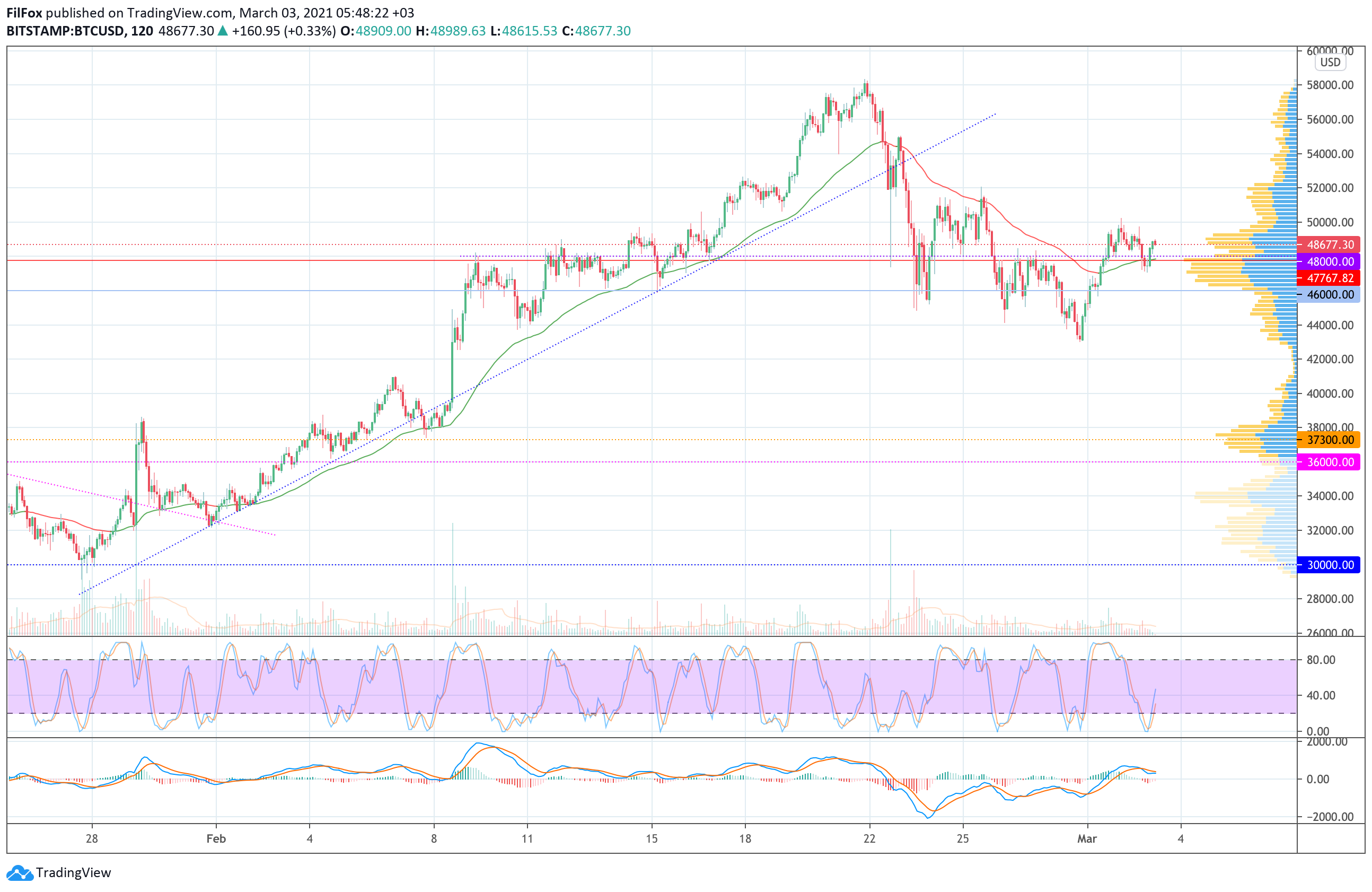 Вчера объёмы торгов были ниже среднего уровня и цена BTC консолидировалась в боковом диапазоне с поддержкой на уровне 48300.00 USD. Вечером продавцы продавили эту поддержку и вернули пару в область средних цен, но за минувшую ночь пара смогла восстановиться в зону вчерашней консолидации.