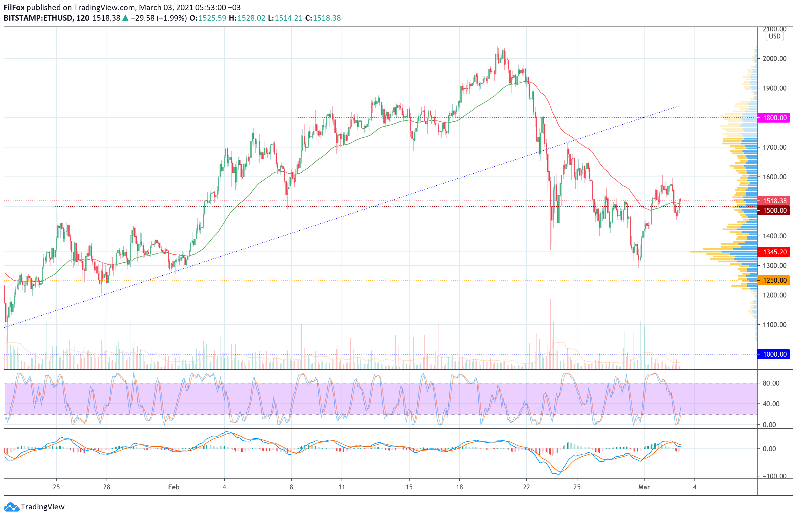 Вчера покупатели не смогли преодолеть сопротивление на уровне 1600.00 USD, и на малых объёмах цена Ethereum постепенно откатилась ниже двухчасовой EMA55.