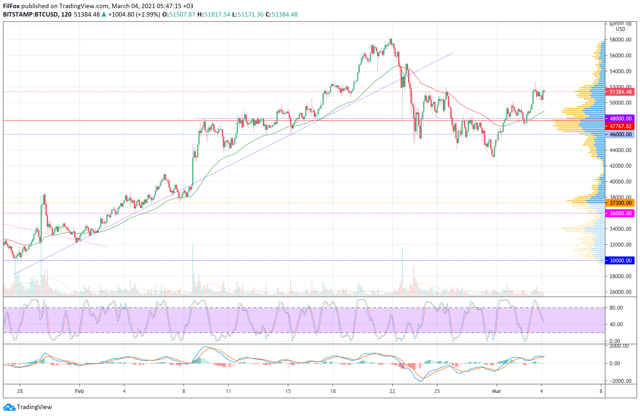 Полагаем, что в ближайшее время цена BTC восстановится в зону вчерашнего максимума и продолжит рост в район отметки 54000.00 USD.
