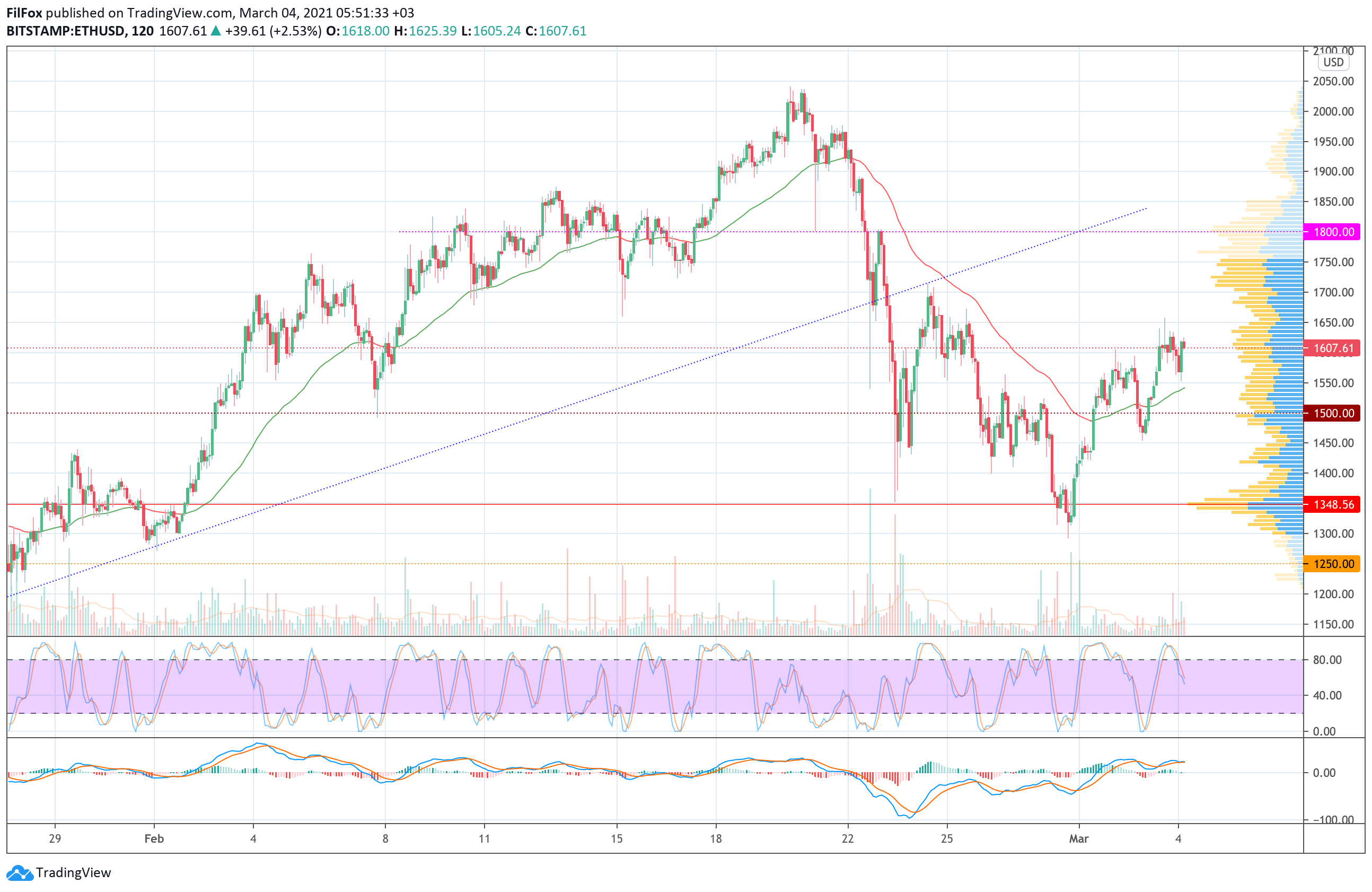 Вчера утром цена ETH закрепилась над двухчасовой EMA55 и покупатели попытались пробить сопротивление 1600.00 USD. Дневной максимум установлен в точке 1658.00 USD, но до конца дня пара не смогла удержаться выше сопротивления 1600.00 USD.