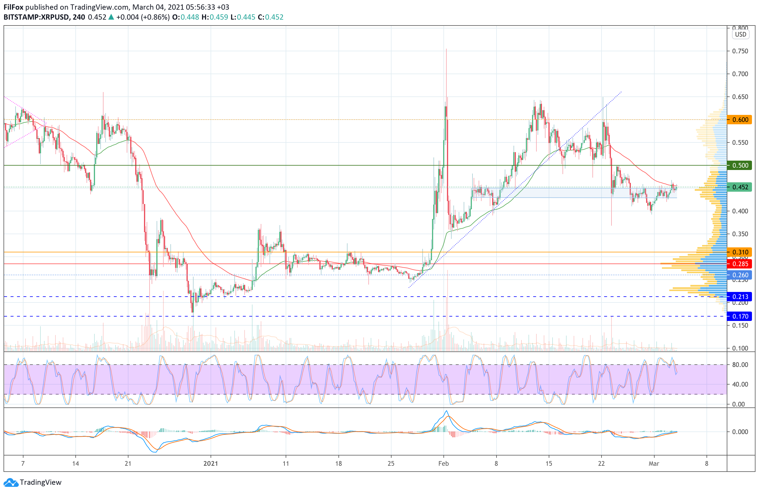 В настоящий момент пара вернулась в голубой коридор и удерживается в районе верхней границы бокового диапазона. Возможно покупатели смогут сегодня воспользоваться поддержкой 0.450 USD и продолжить восстановление. Таким образом до конца недели цена XRP может протестировать психологическую отметку 0.500 USD.