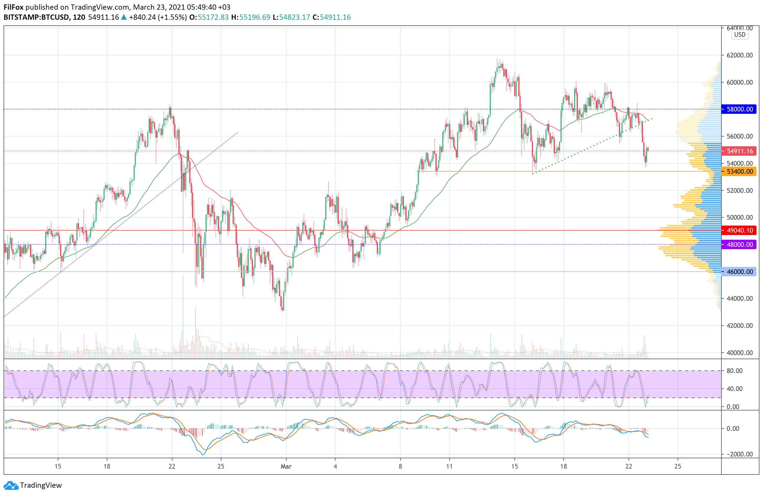 Вчера вечером продавцы сломали поддержку восходящей зелёной линии тренда. Поздно ночью давление медведей усилилось и пара обозначила локальный минимум в точке 53715.00 USD.