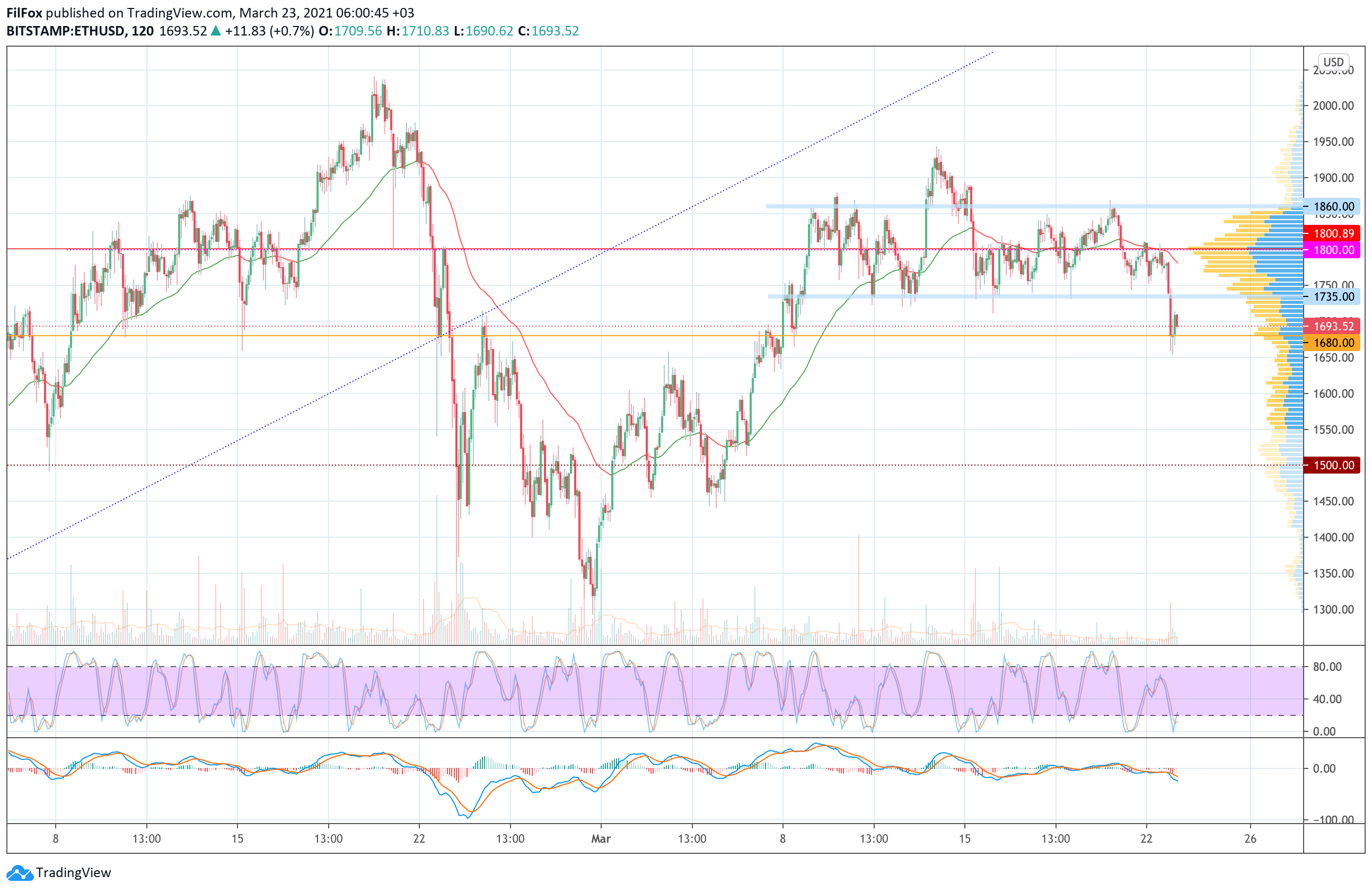 Вчера цена Ethereum долго консолидировалась в районе линии POC (1800.89 USD). Поздно вечером медведи пробили нижнюю границу двухнедельного бокового коридора и протестировали поддержку 1680.00 USD.