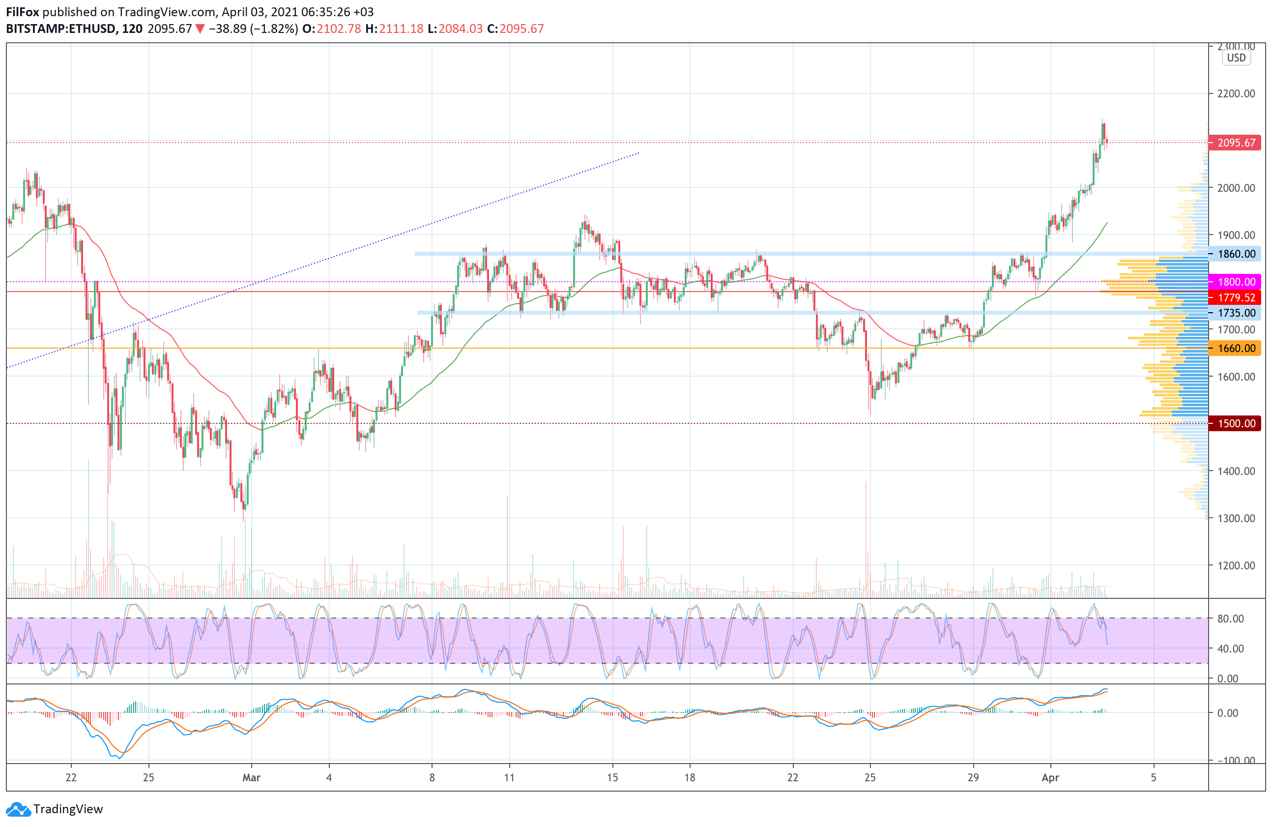 Вчера утром цена Ethereum протестировала уровень 2000.00 USD и в течение дня пыталась справится с этим психологическим порогом. Во второй половине дня быки сформировали импульс, который продолжил Bull run, в результате чего, сегодня ночью, цена эфира обновила абсолютный максимум в районе отметки 2145.00 USD.
