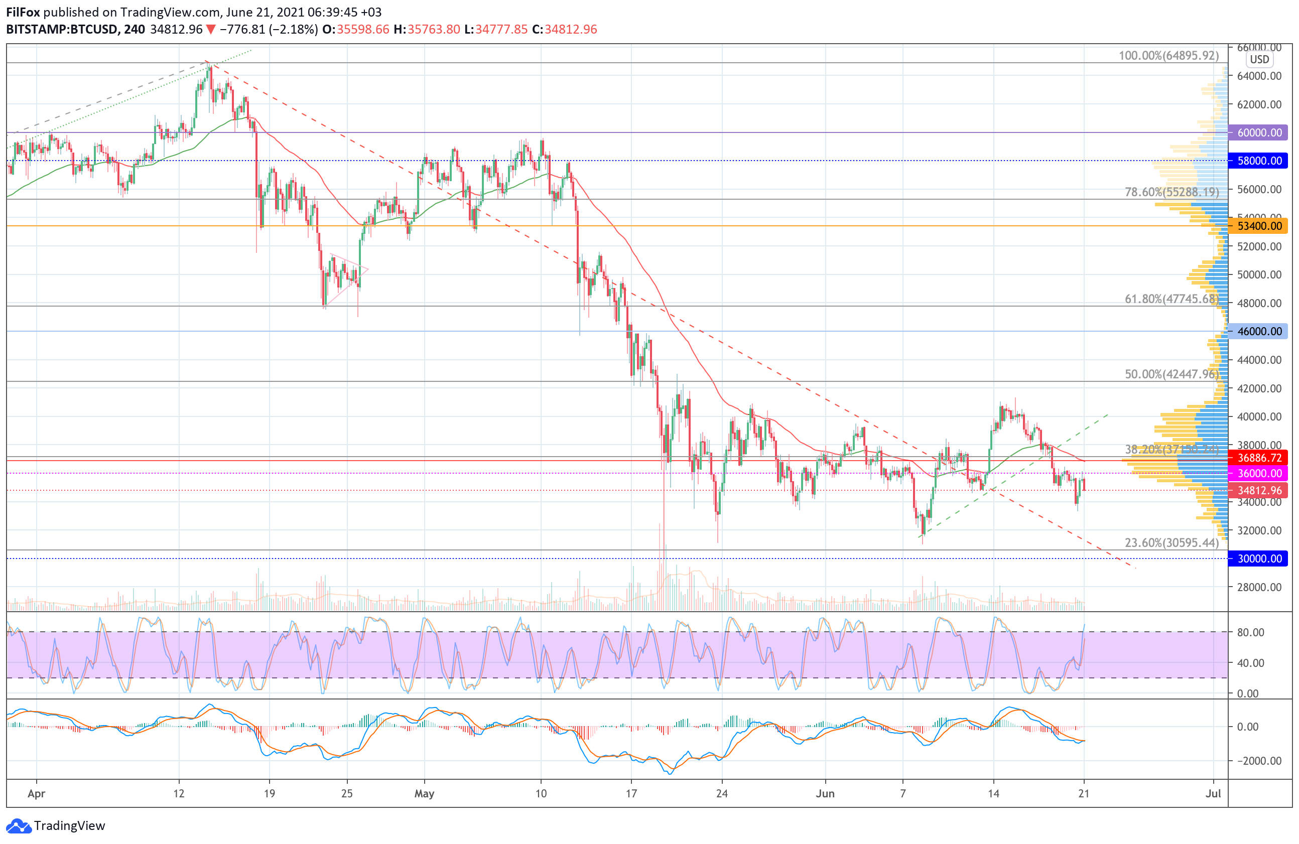 В завершении дня покупатели попытались восстановить пару, но добравшись до сопротивления 36000.00 USD - силы быков иссякли. На утро пара откатилась в область 34500.00 USD и в первой половине дня снижение может продолжиться в район отметки 33000.00 USD.