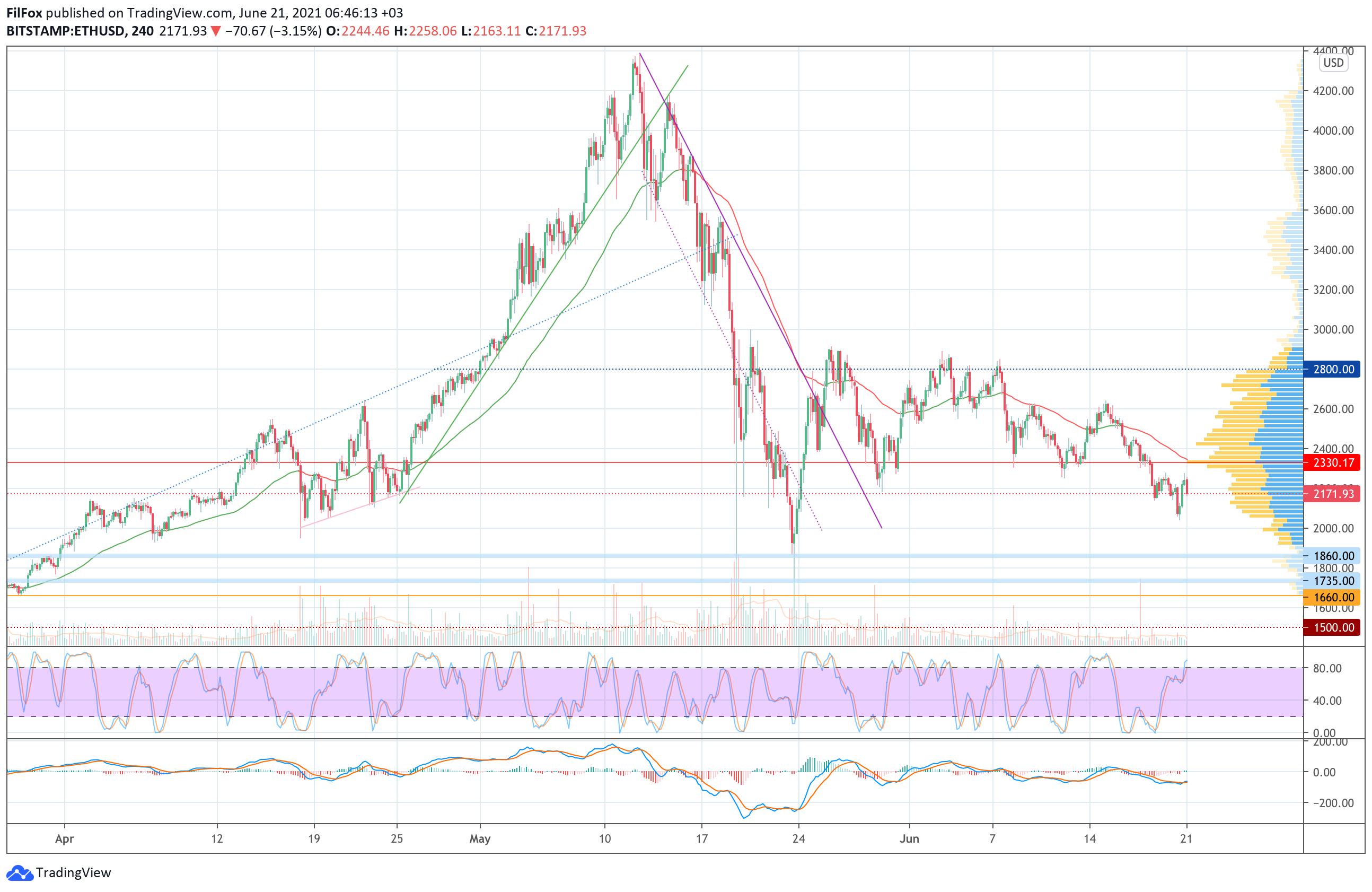 Вчера медвежье давление усилилось и цена Ethereum обновила июньский минимум в районе отметки 2040.00 USD.