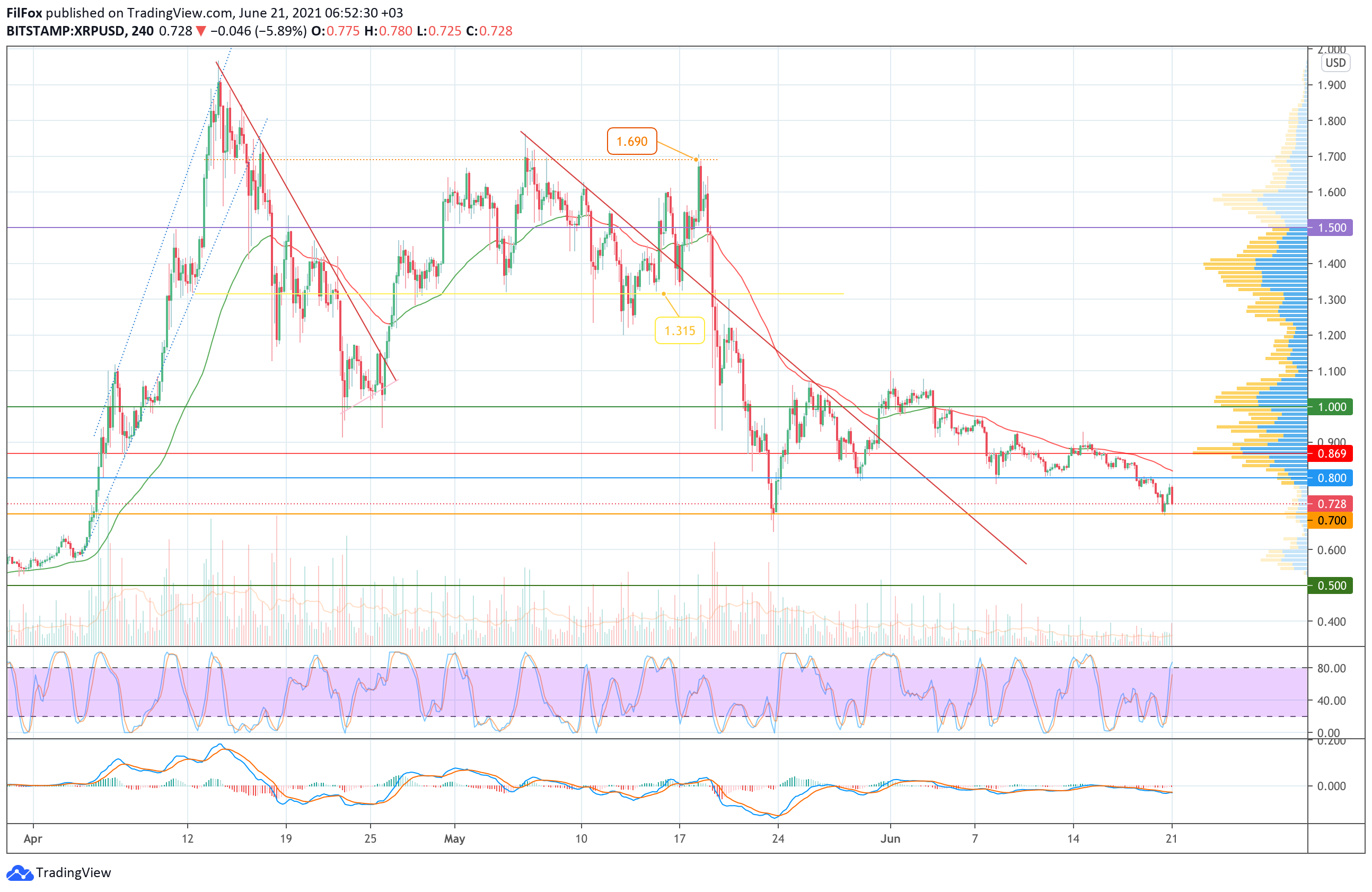 В минувшее воскрсенье падение цены XRP приостановилось в районе поддержки 0.700 USD. Ночью покупатели пытались восстановить пару, но так и не смогли протестировать уровень 0.800 USD.