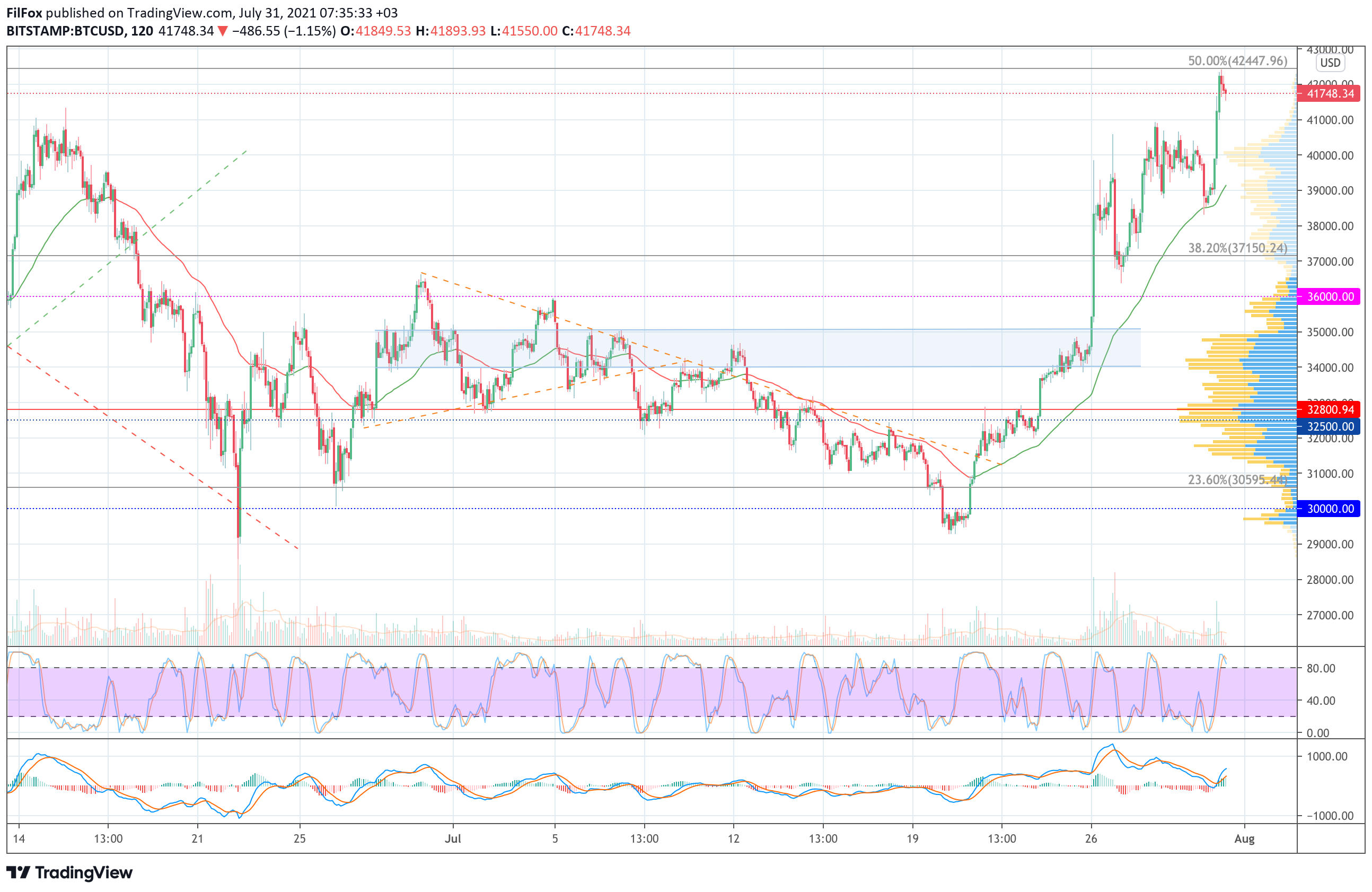 Сегодня ночью рост проходил на средних объёмах и июльский максимум зафиксирован в точке 42335.50 USD. Пара пока не может преодолеть сопротивление 50% фибо (42447.96 USD) так как крупные покупатели остаются вне рынка.