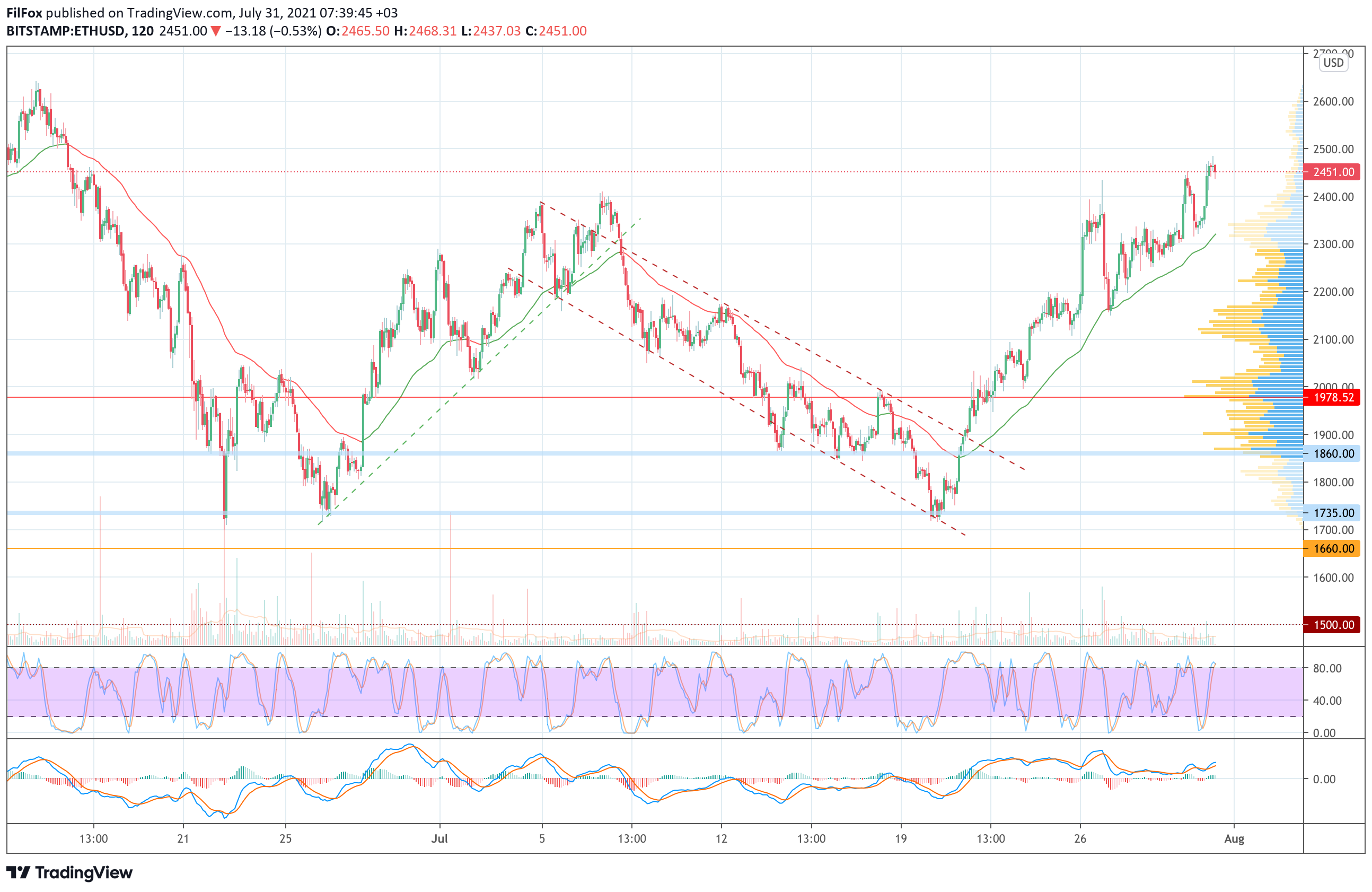 Вчера после утреннего отката пары ETH/USD, покупатели предприняли ещё одну попытку протестировать сопротивление 2500.00 USD. Поздно вечером им удалось сформировать бычий импульс, который позволил обновить июльский максимум до отметки 2485.00 USD, но протестировать целевой уровень быки пока не смогли.