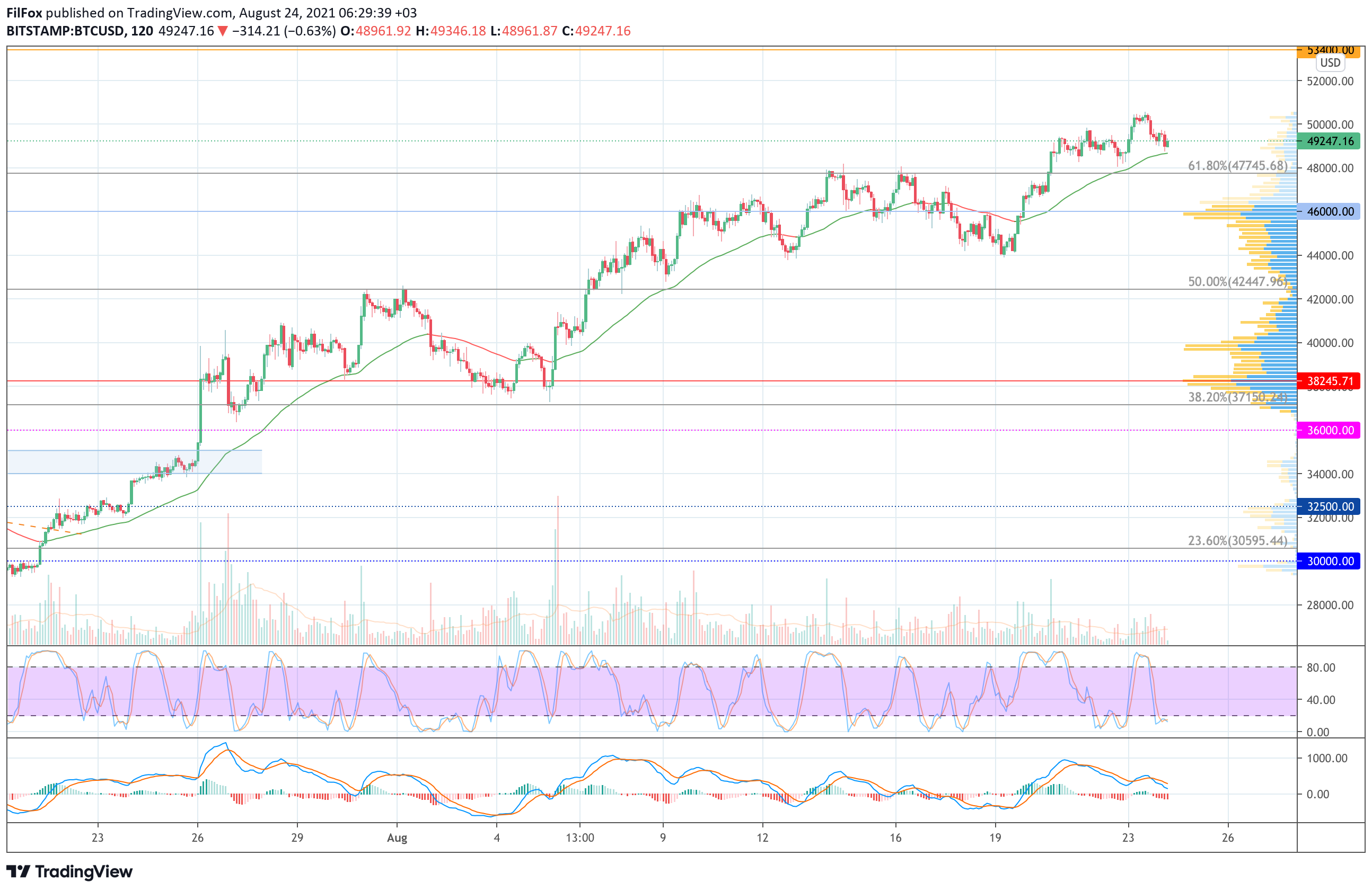 Вчера в первой половине дня, после утреннего максимума, рост цены BTC ещё немного продолжился к новому летнему рекорду в район отметки 50560.00 USD. Вместе с тем, объёмы продаж стали существенно превышать средний уровень, и цена биткоина начала снижаться.