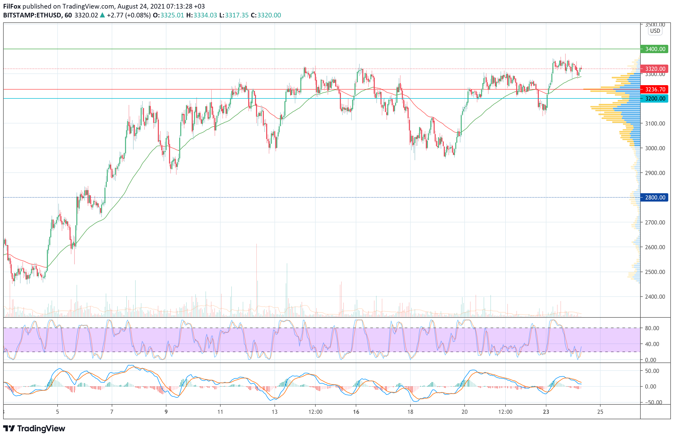Вчера покупатели не смогли нарастить объёмы, и цена Ethereum так и не протестировала целевой уровень 3400.00 USD. Всё, чего смогли добиться быки за вчерашний день - это обновить месячный максимум до отметки 3380.00 USD, после этого пара откатилась в область средних цен.