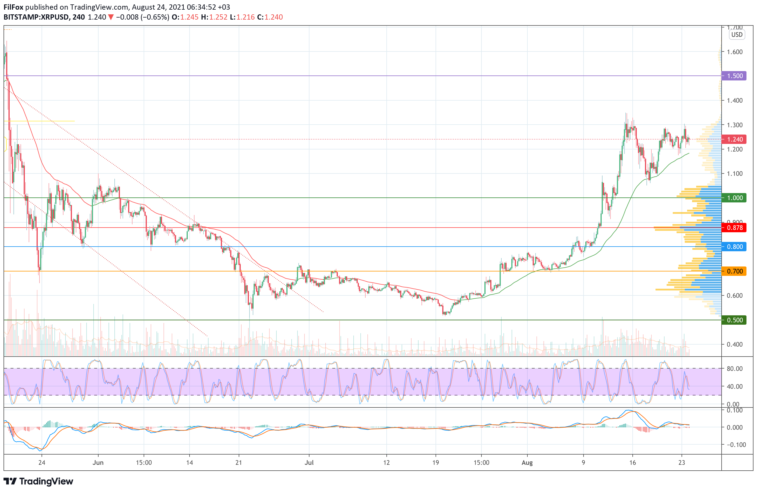Вчера покупатели предприняли отчаянную попытку пробить сопротивление 1.300 USD, но удержаться выше этого уровня цена XRP не смогла, и во второй половине дня пара вернулась к поддержке 1.200 USD.