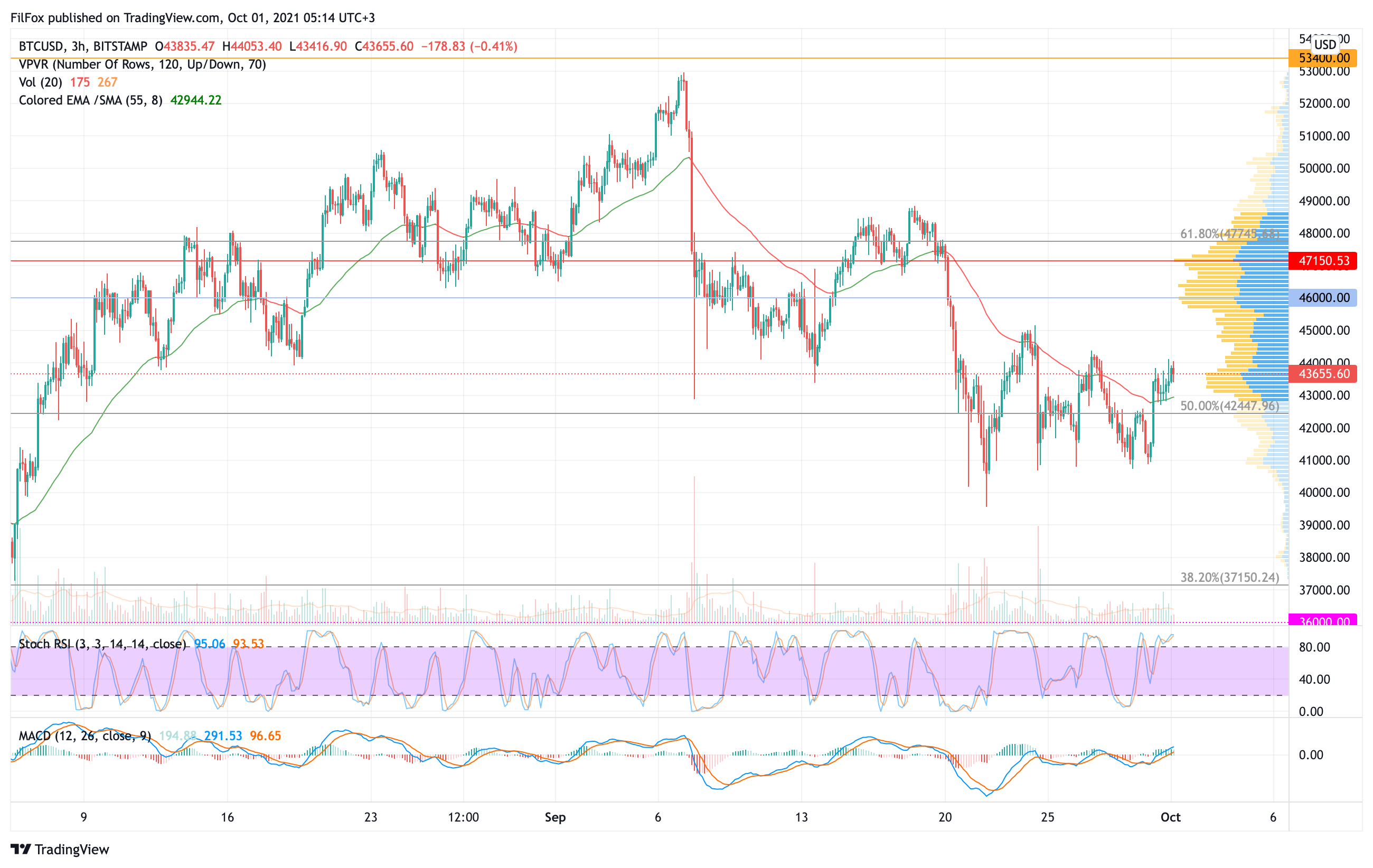 Вчера утром восстановление цены BTC замедлилось в районе отметки 43800.00 USD. Несмотря на противодействия медведей, днём пара смогла закрепиться выше трёхчасовой EMA55, воспользовавшись поддержкой этой скользящей средней.